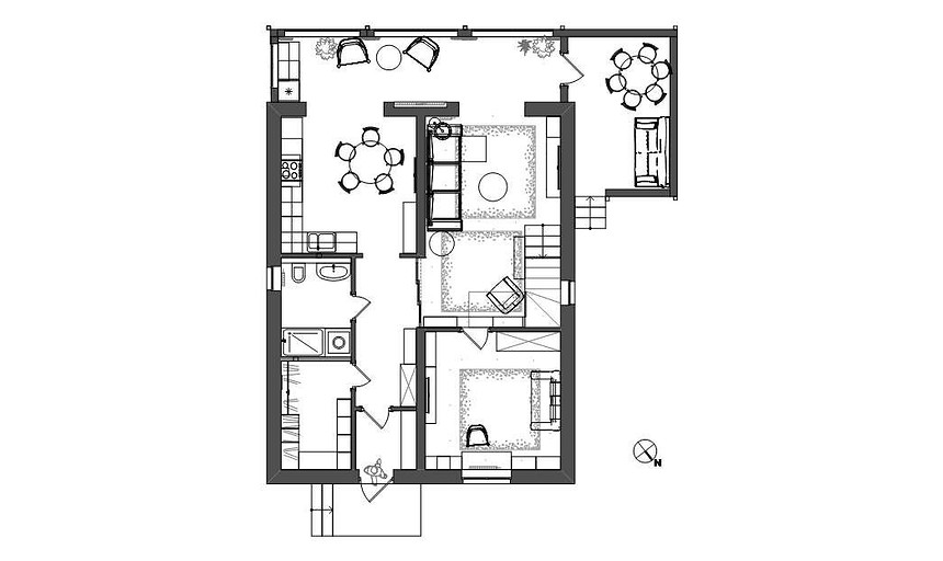 Новый проект небольшого загородного дома. Гостиную и кухню мы совместили с террасой, тем самым добавили к полезной площади ещё 14,77 м2. Утеплили террасу и убрали балконные двери и подоконные блоки. Результат нашей работы — это создание современного образа жизни наших заказчиков.