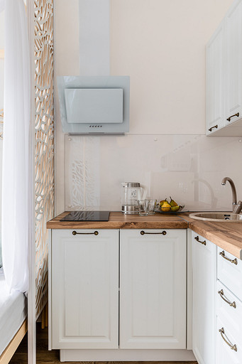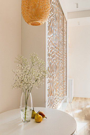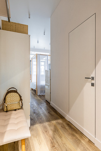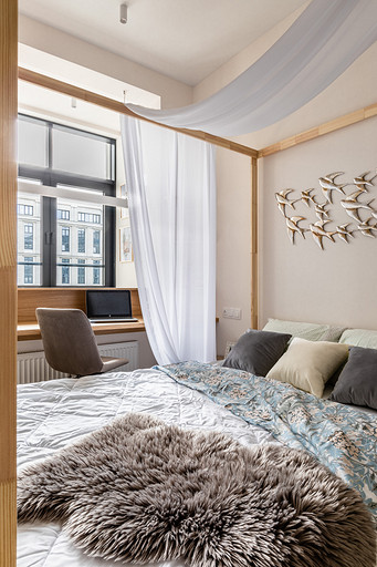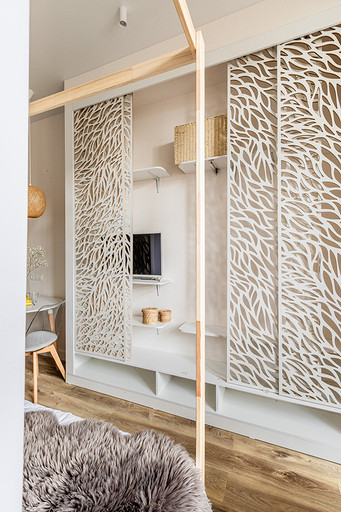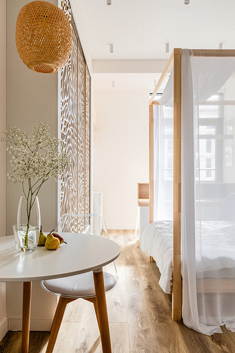 Студия для аренды с акцентами на природных и натуральных материалах и оттенках, обилие света и домашнего уюта на небольшой площади. За счет резных перегородок из мдф пространство делится на несколько функциональных зон: кухня с обеденным столом, зона с полноценной двуспальной кроватью с балдахином, который дополнительно отделяет пространство. Рабочий стол, совмещенный с барным, выполнен на подоконной части между лоджией и комнатой. Большое количество мест для хранения: комод на лоджии, открытые полки, распашной метровый шкаф в коридоре и большой встроенный шкаф с раздвижными дверцами опять же из резных перегородок мдф, за которыми расположилась открытая система хранения и зона тв. За счет грамотного расположения сантех приборов и применения зеркал совмещенная ванная комната 4м.кв. выглядит визуально больше и просторнее.