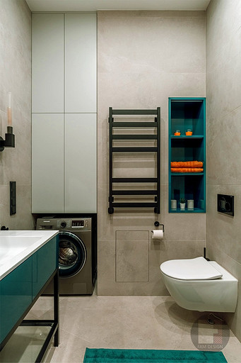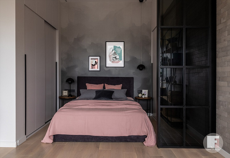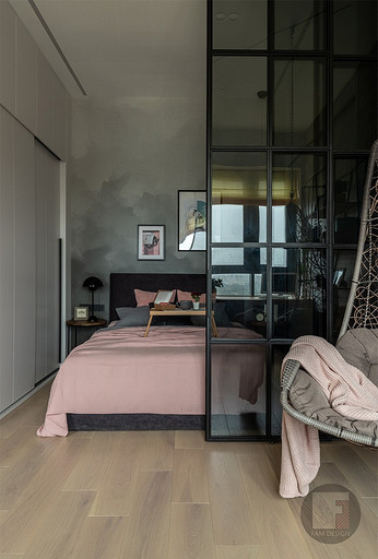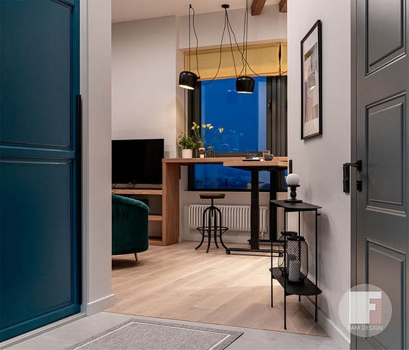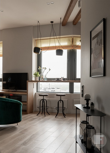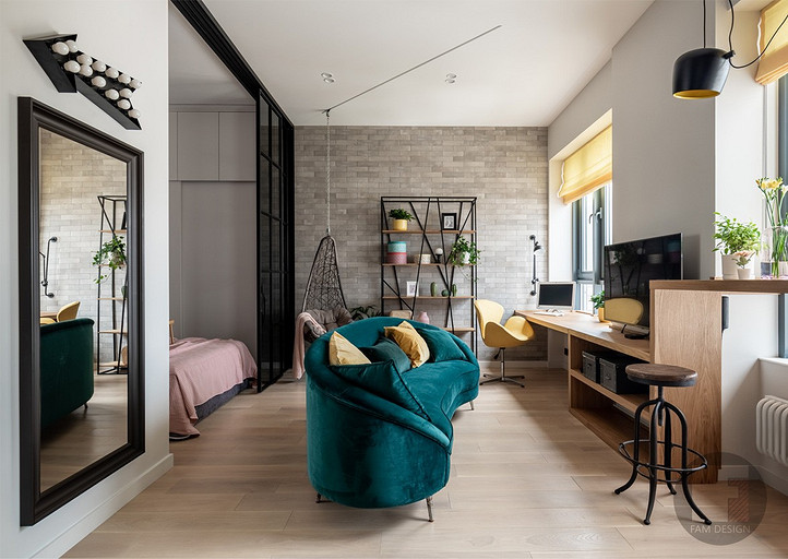 Проект переделки двухуровневой квартиры в 2 независимые студии, для брата и сестры-студентов. Была выбрана стилистика ЛОФТ, но для девушки его выполнили в более ярком и женственном варианте. В небольшом помещении 45кв.м есть все необходимое — небольшая спальная зона, отделяемая от остального помещения раздвижной перегородкой, где вместо стены используются два вместительных шкафа — со стороны прихожей и со стороны спальни; и рабочий кабинет и гостиная и кухня-столовая — все в виде отдельных зон в общем открытом пространстве. Сложную геометрию помещения обыграли конструкцией из рабочего стола, переходящего в ТВ-тумбу и продолжающегося в виде барного стола в зоне кухни. Есть зона отдыха с подвесным креслом, которое можно переместить в гостиную. В гостиной вместительный изящный диван, яркий цветовой акцент, который при желании может быть перемещен из центра к стене. Небольшая кухня вмещает все необходимое, а под барным столом прячется еще один, с регулируемой высотой, который можно выкатить и организовать прием гостей.
