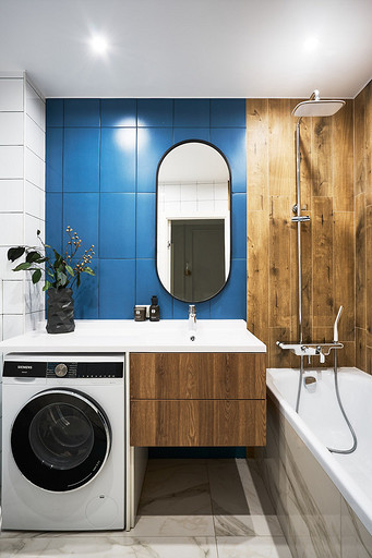 - Стены: керамогранит под дерево Meissen, белая плитка Kerama Marazzi, синяя плитка Lb Ceramics
