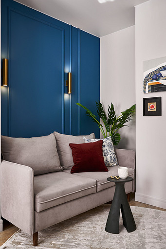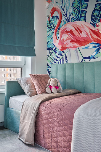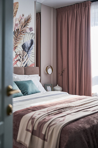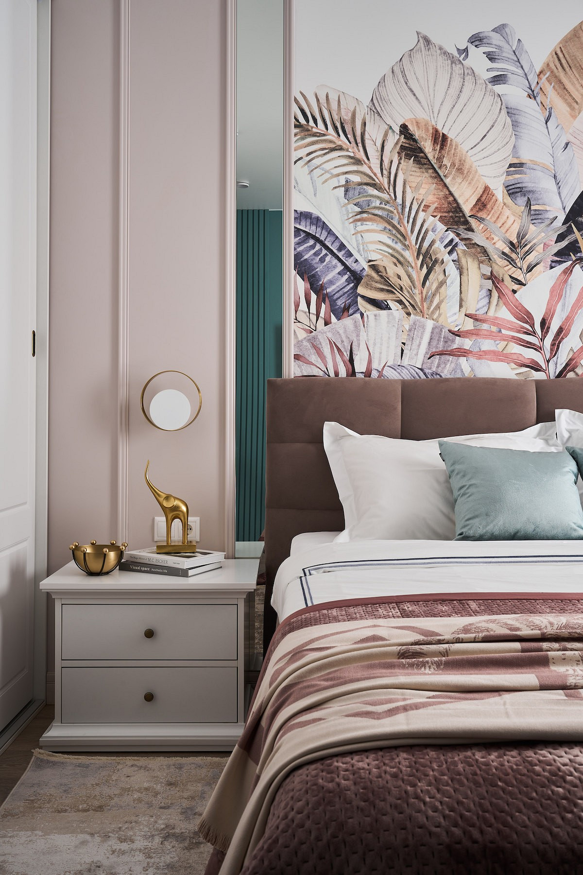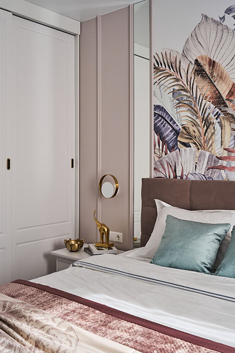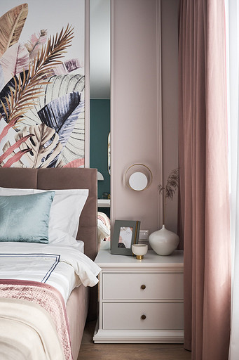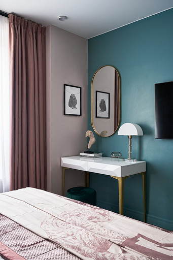 - Стены: краска Little Greene, фотообои Alltowall, кровать «Орматек», прикроватные тумбы Lazurit, консоль (туалетный столик) Garda Decor, пуф Dreambag