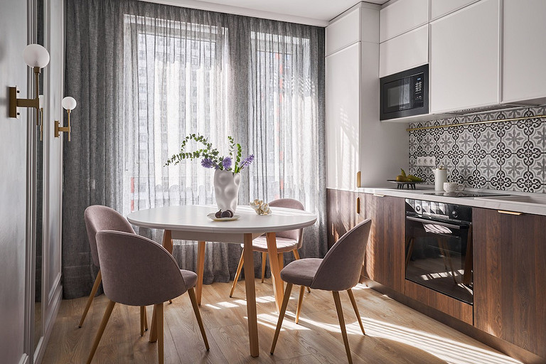 - Мебель: диван RM Home, стулья E-style, стол Ask, кофейный столик Ceramum, кухонный гарнитур сделан на заказ