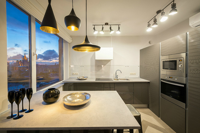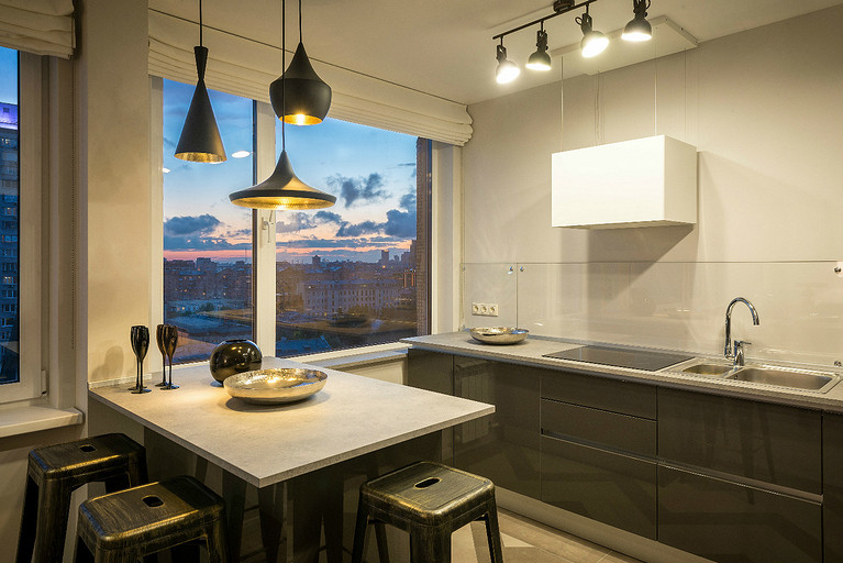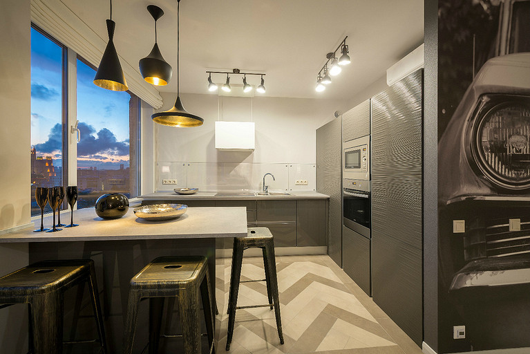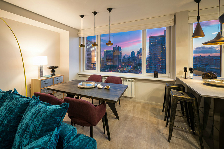 Правильно расставленная мебель, тщательно выбранный рисунок фотообоев и другие дизайнерские приемы помогли вызиуально увеличить небольшую квартиру и скрыть такой недостаток, как низкие потолки.