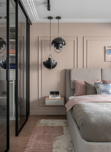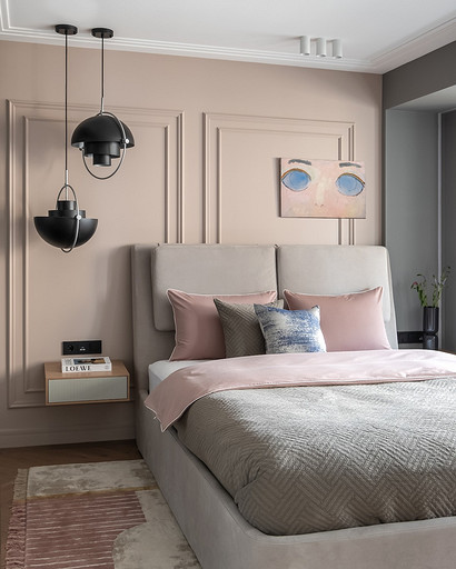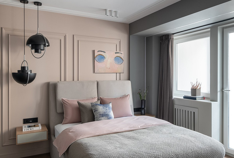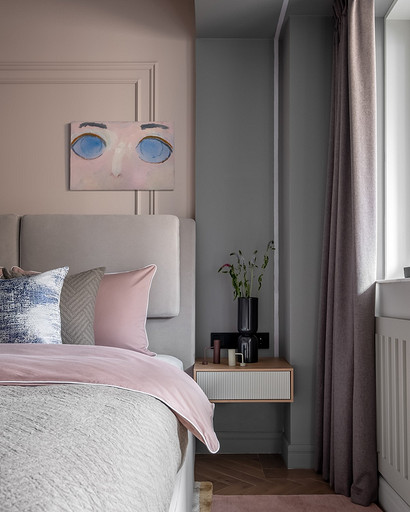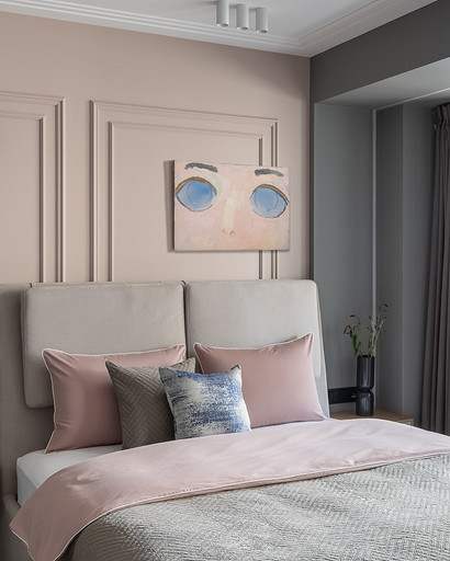 - Декор: Lappartement, ваза 101 copengagen, картины Якова Хомича «Синие глаза» (над кроватью) и Екатерины Лысак «Треснувший лед» (над тумбой)