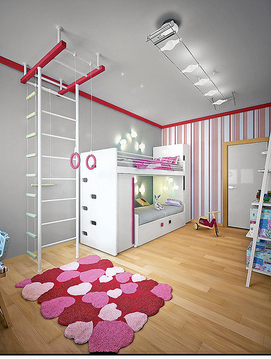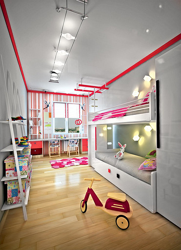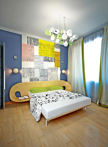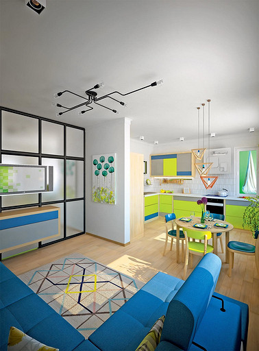 Позитивный, несложный в реализации интерьер для молодых активных родителей и двух детей. Оформление построено на сочетании нейтральных по цвету стен и пола с яркими предметами мебели. Предпочтение отдано натуральным материалам.