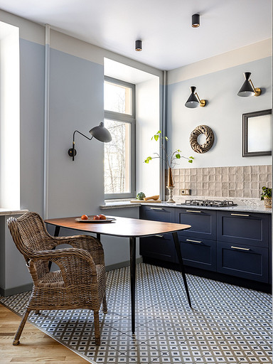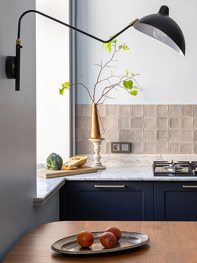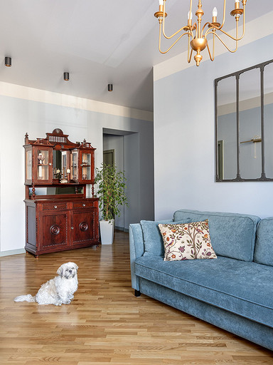 - Мебель: кухня сделана на заказ, диван SK Design, буфет — антиквариат