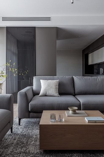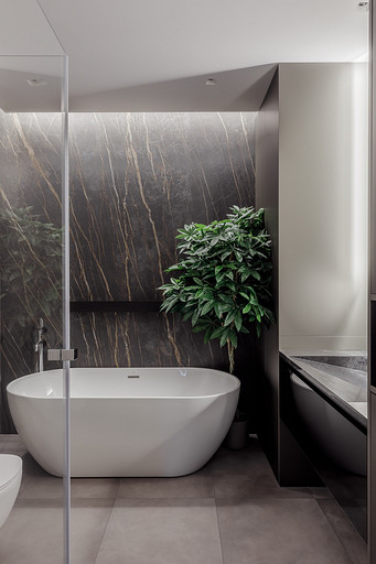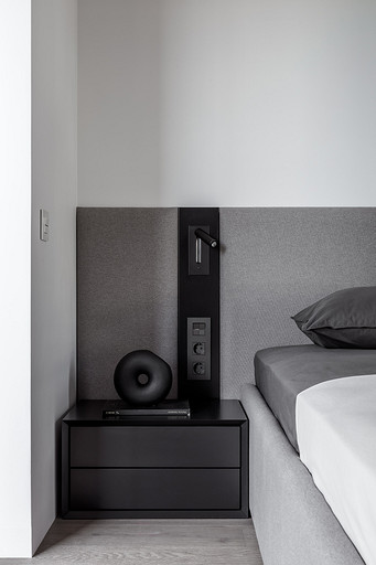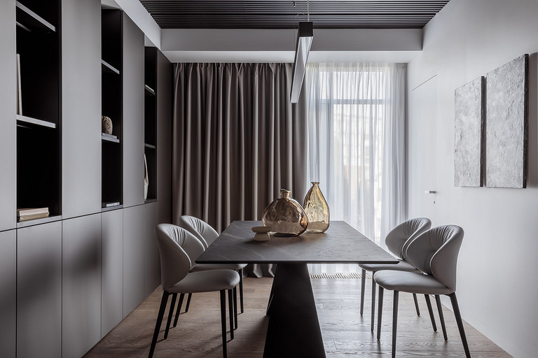 Заказчики приобрели апартамент площадью 108 кв.м. в Сочи для отдыха и частых встреч с друзьями. Поскольку сами являются архитекторами, они очень кропотливо отнеслись к выбору студии для проектирования современного минималистичного пространства и сделали свой выбор после просмотра одного из реализованных проектов. Основными моментами, которые необходимо было учесть при проектировании, было расположение гостиной-кухни, двух спален, двух санузлов и гардеробной, а также отсутствие визуального шума и разнообразия материалов и фактур в пространстве. Но основным вызовом стали низкие потолки и большое количество ригелей и колонн, что стало отправной точкой при организации пространства. Переход из прихожей в гостиную выполнен на контрасте: из темной компактной зоны попадешь в светлую гостиную, за счет чего она выглядит еще просторнее. Общественная зона в свою очередь разделена на гостиную и кухню-столовую за счет объемов встроенной мебели, привлекающих внимание за счет металлизированной фактуры фасадов. Такое решение позволяет пространству меняться в различное время суток и при искусственном освещении. Для отделки стен во всей квартире выбрано всего два оттенка краски, но объемы и фактуры выбраны таким образом, чтобы пространство выглядело динамичным. Для сохранения легкости и целостности в пространстве применены такие решения, как скрытые плинтусы и двери, канальные кондиционеры, внутрипольные конвекторы в цвет пола, а розетки и выключатели повторяют цвета стен.