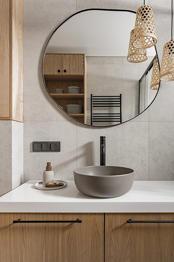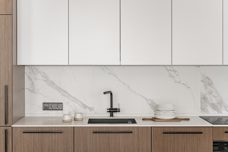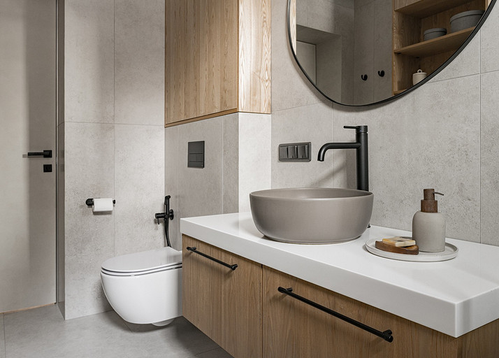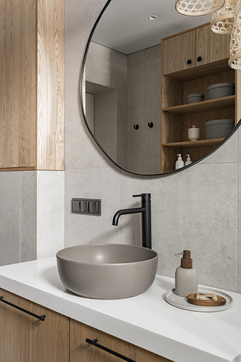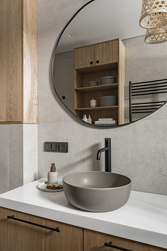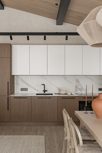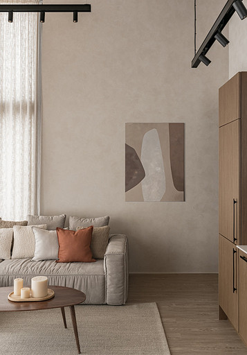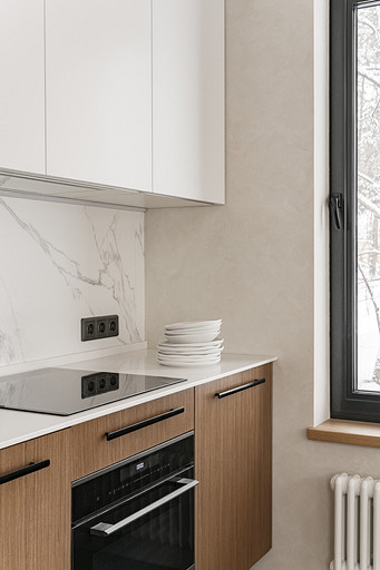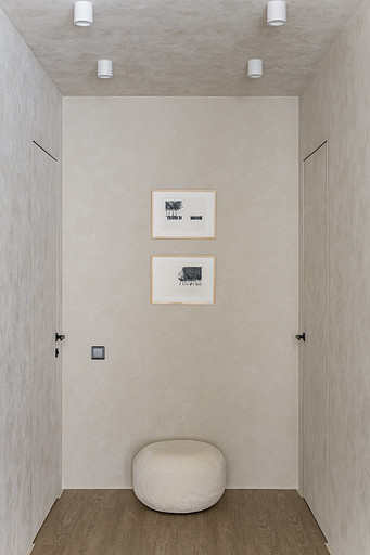 - Стены: декоративная штукатурка Derufa, обои под покраску A.S.Creation, краска Dulux, керамогранит Estima