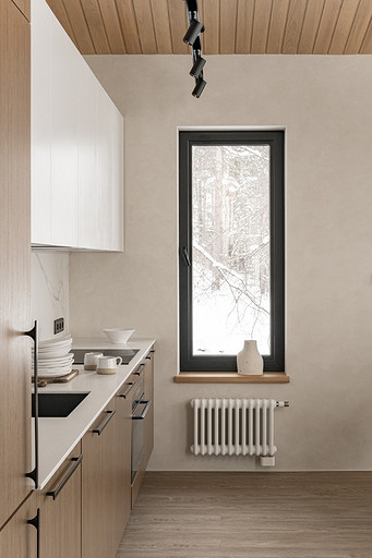 - Наружные стены: целлюлозная ветрозащита (толщина 25 мм), изоляция — минеральная вата (толщина 200 мм), пароизоляция, внешняя отделка — вентилируемый фасад из имитации бруса, лессирующее масло Adler