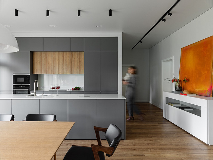 - Потолки: натяжные ПВХ-полотна с теневым профилем EuroKraab