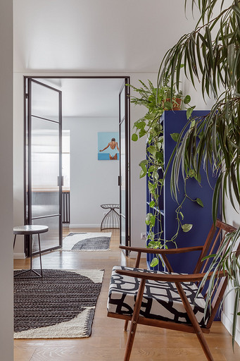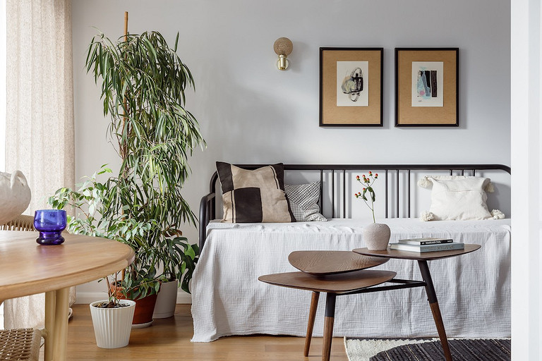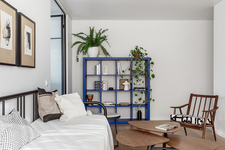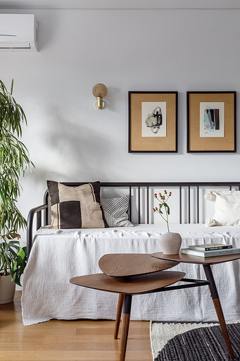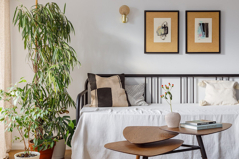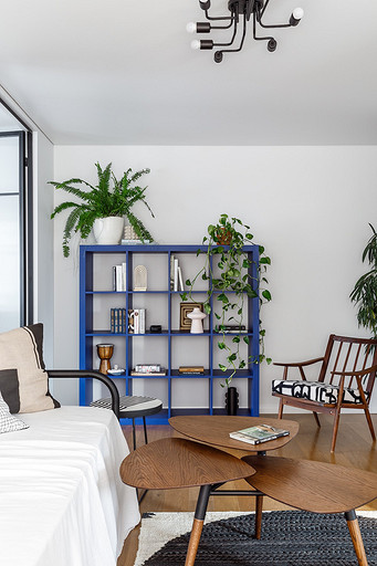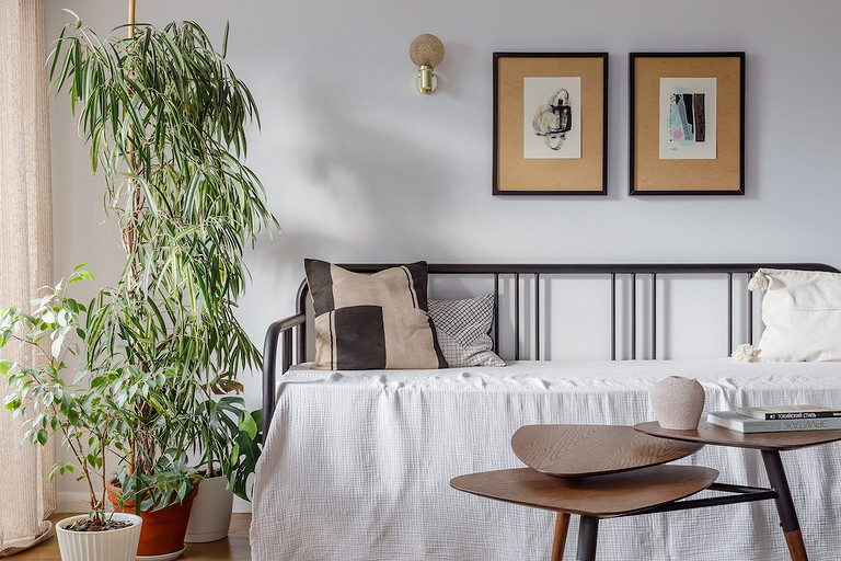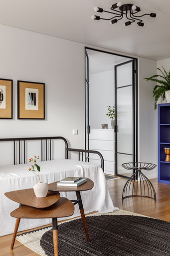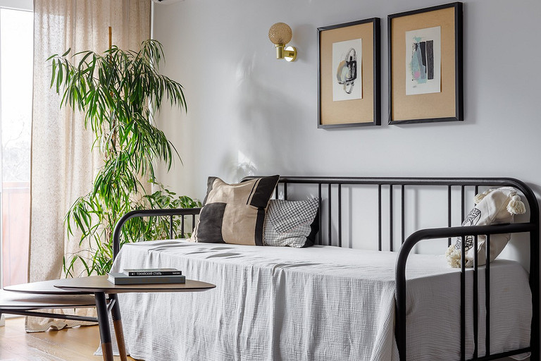 - Мебель: кушетка и стеллаж ИКЕА, журнальный столик «Поставская мебельная фабрика» (Беларусь), кресло — винтаж
