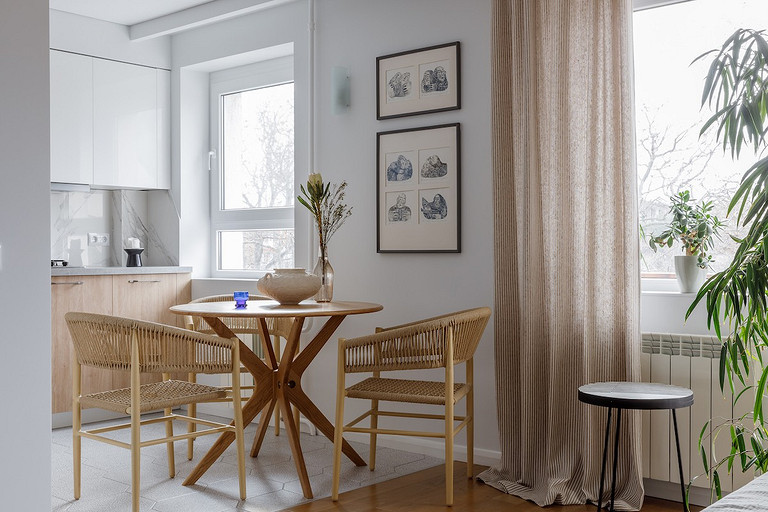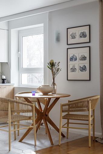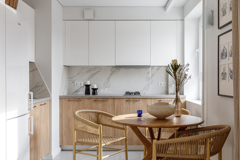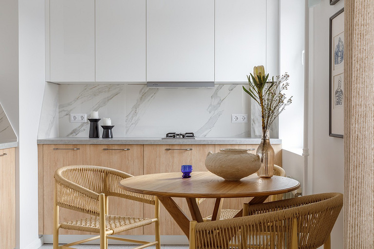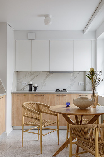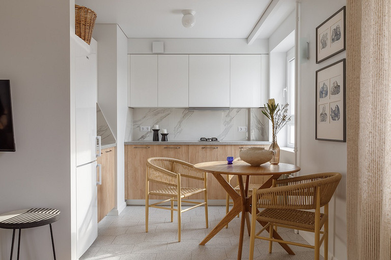 - Мебель: кухня «Леруа Мерлен», обеденный стол «Поставская мебельная фабрика» (Беларусь), плетеные стулья DeepHouse