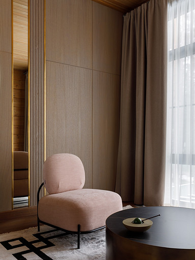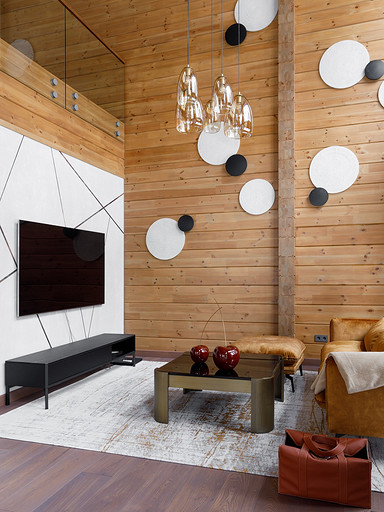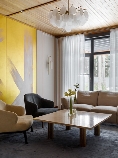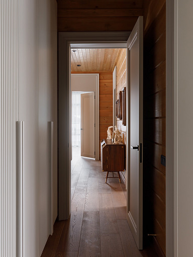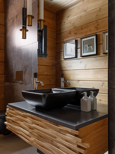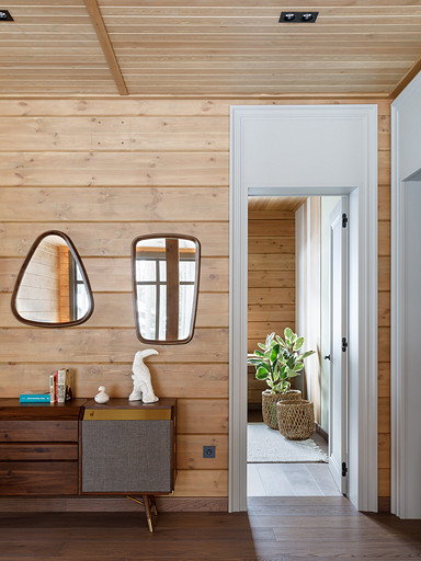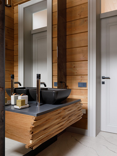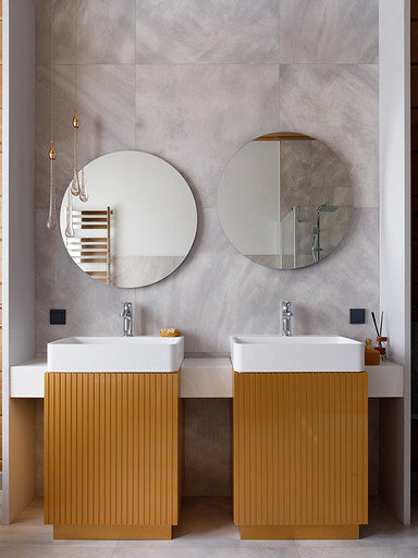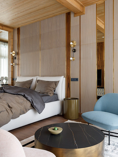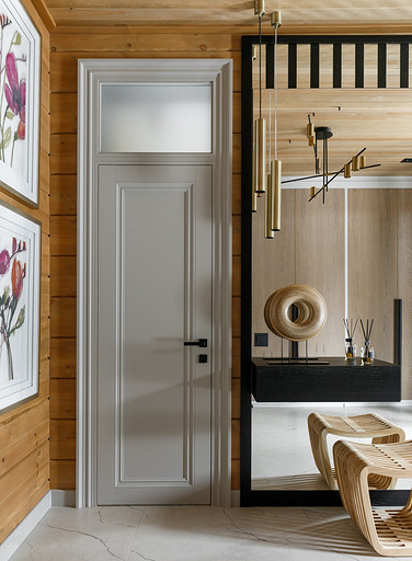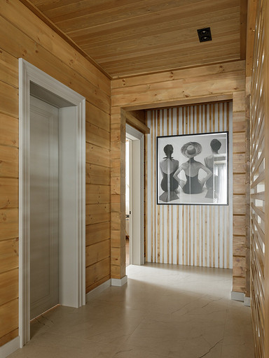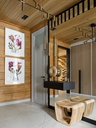 - Стены: матовый лак Tikkurila, панели из дерева абаши, МДФ-панели, панели из ореха с латунными вставками, керамическая плитка Apavisa Porcelánico