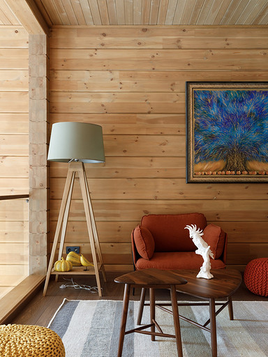- Потолки: сосновая вагонка, матовый лак Tikkurila
