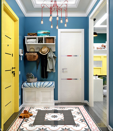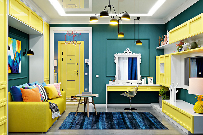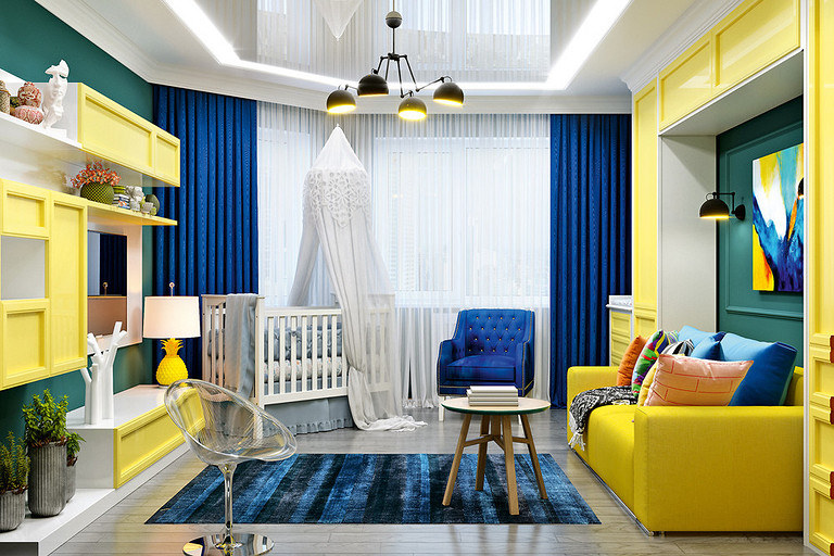 Владельцы этой квартиры — молодая пара, у которой скоро появится ребёнок. Именно поэтому в дизайне преобладают современные мотивы и яркие краски, а пространство организовано с учётом скорого появления малыша.