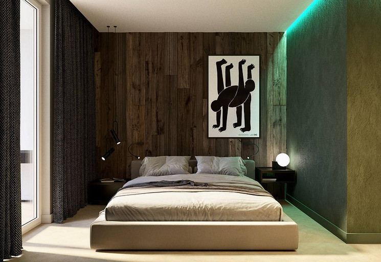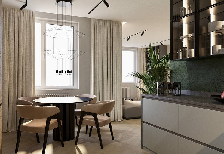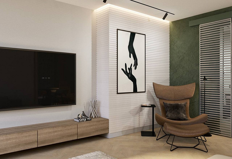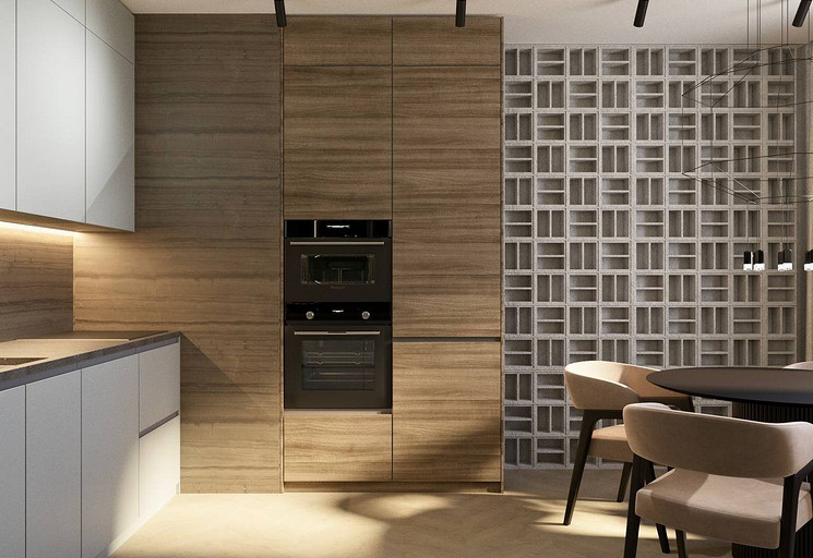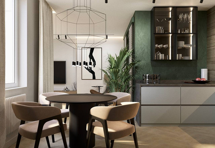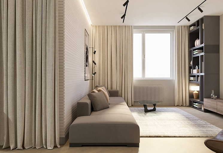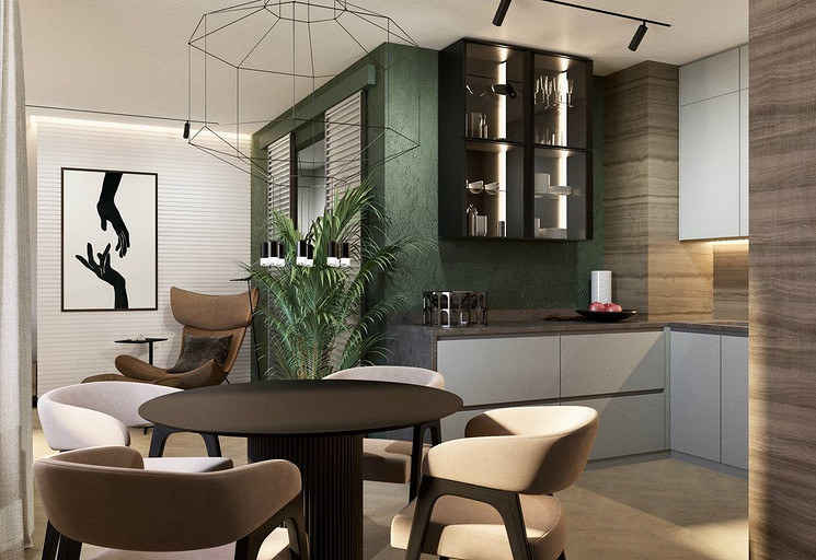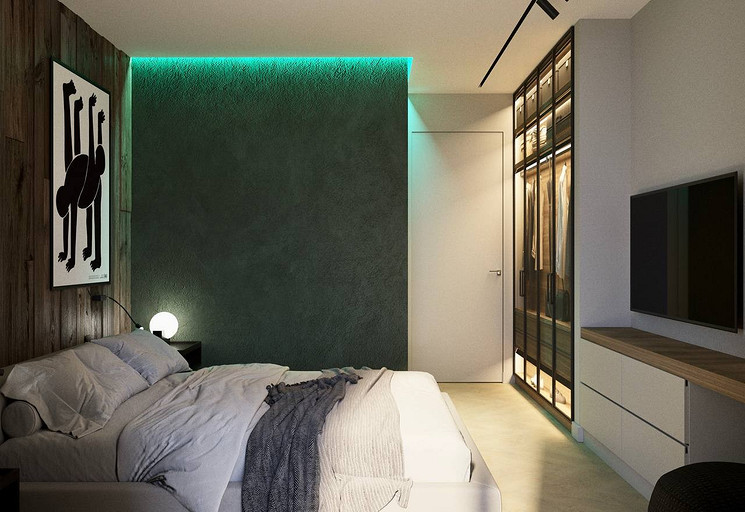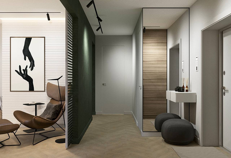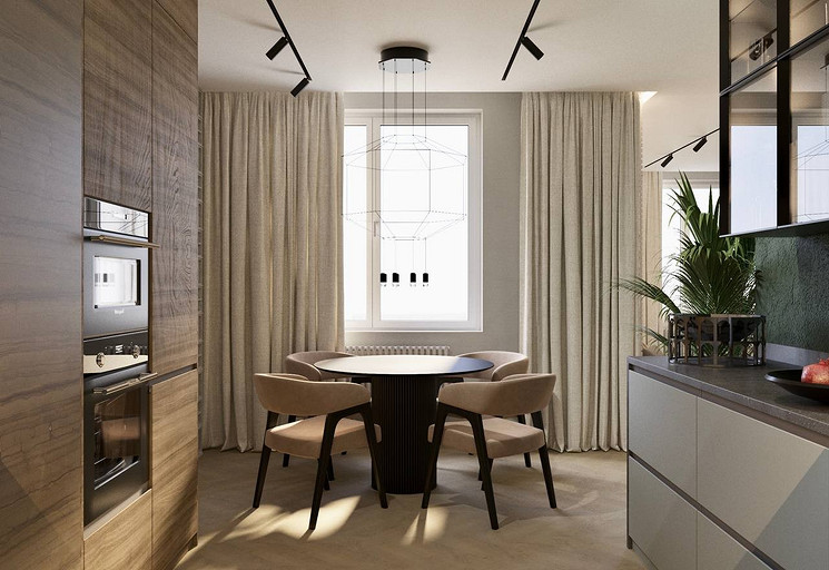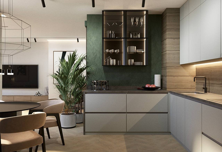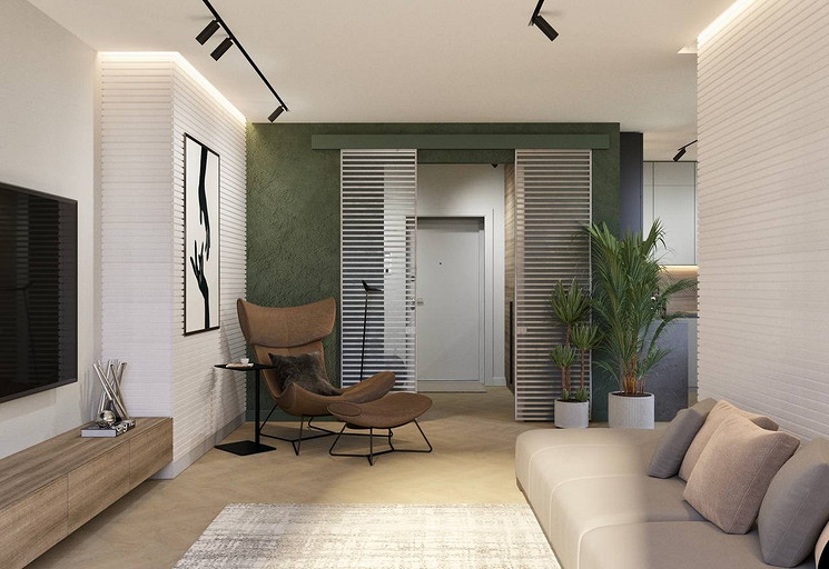 Квартира студия в Москве для молодой пары. Преимущественно натуральные материалы и цвета, уютные подсветки и чистые поверхности. Большая светлая зона гостиной кухни и в противоположность ей — темная спальня с зеленым свечением потолочных ниш. Нейтральный просторный санузел, со встроенными современными черными смесителями, отдельная постирочная комната. предусмотрено большое количество мест для хранения.