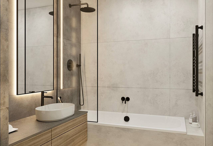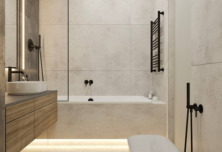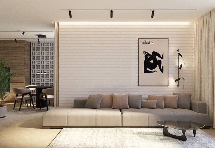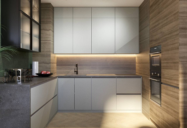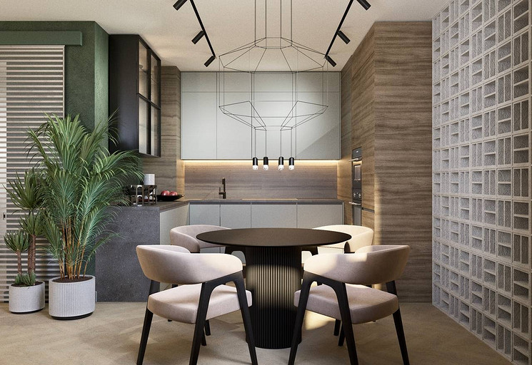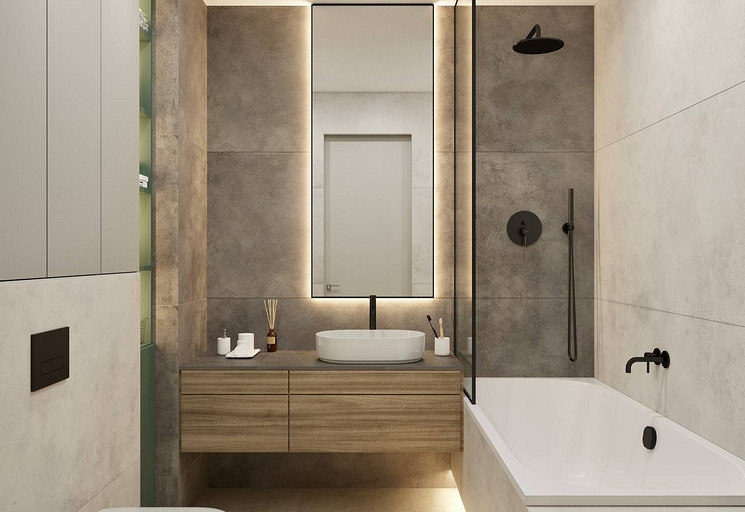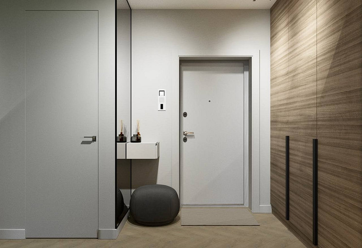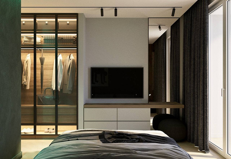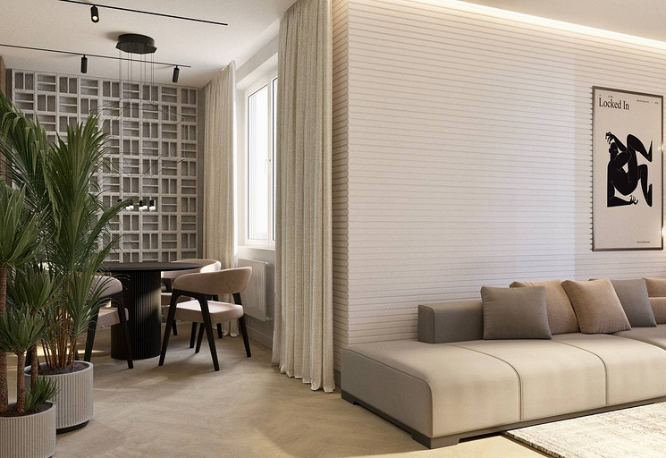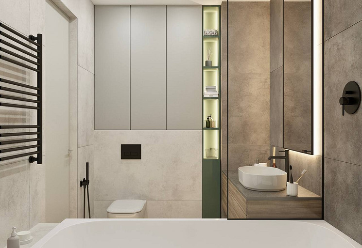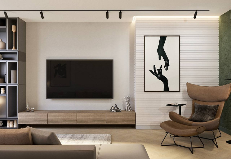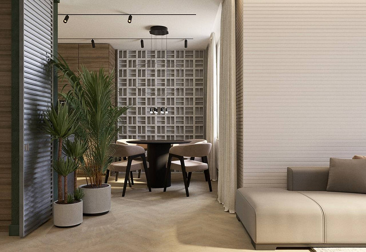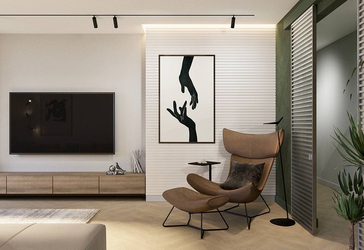 Квартира студия в Москве для молодой пары. Преимущественно натуральные материалы и цвета, уютные подсветки и чистые поверхности. Большая светлая зона гостиной кухни и в противоположность ей — темная спальня с зеленым свечением потолочных ниш. Нейтральный просторный санузел, со встроенными современными черными смесителями, отдельная постирочная комната. предусмотрено большое количество мест для хранения.