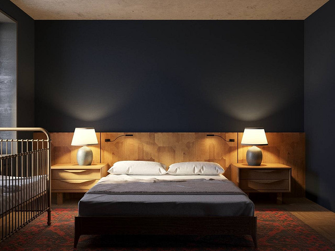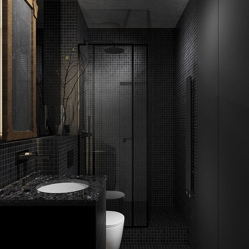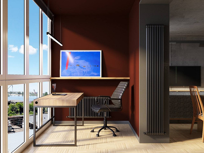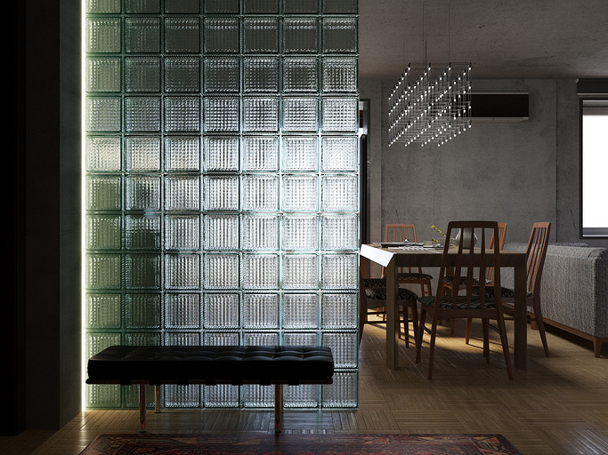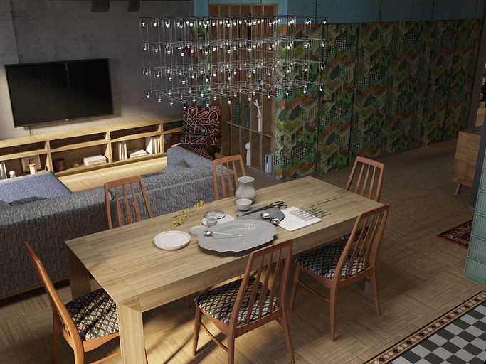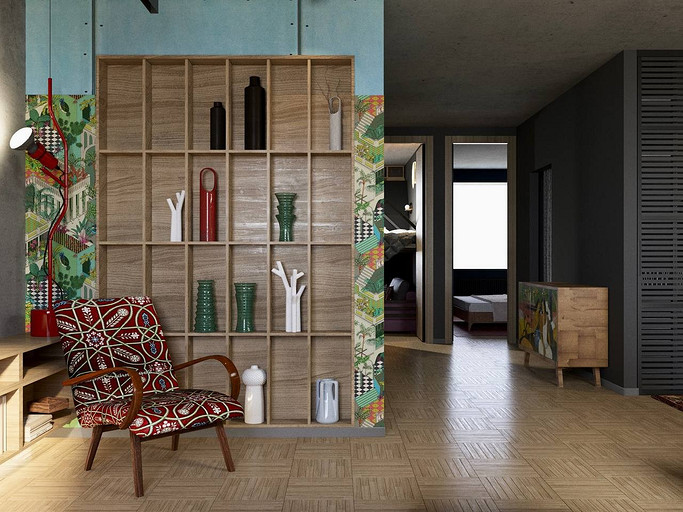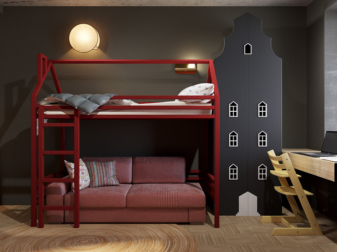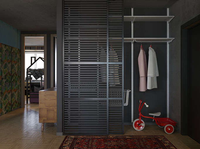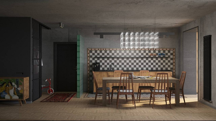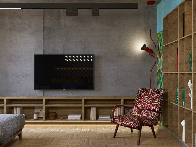 Небольшая евротрешка-студия для семьи с тремя детьми. Компактные спальни и большое общее пространтсво гостиной-кухни. Открытые бетонные потолки с внешней электрикой, стены под покраску, на полу штучный паркет под маслом. Яркие акцентные детали, рулонные шторы на электроприводах, мебель частично советская отреставрированная
