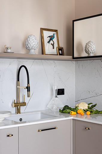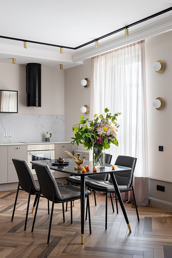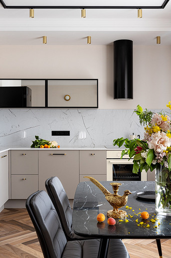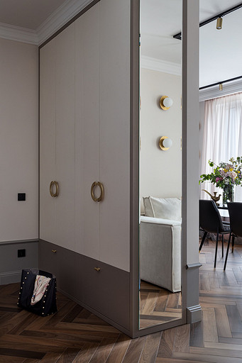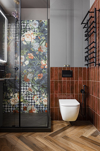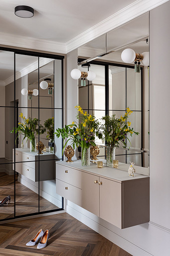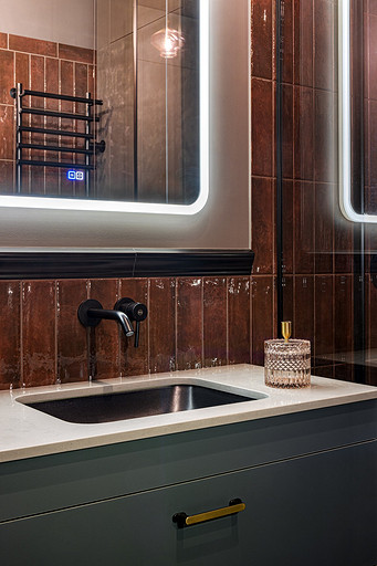 Сложные цвета, зеркала, «елочка» из керамогранита под дерева, латунь — все это сложилось в образ интерьера, где хочется наслаждаться жизнью. Читать далее...