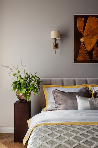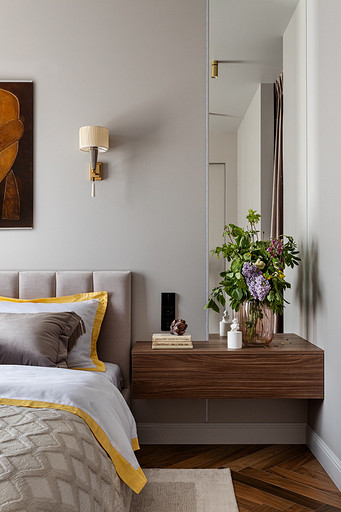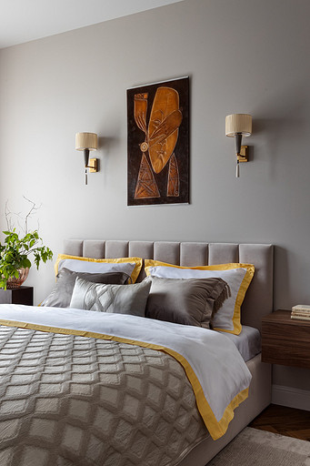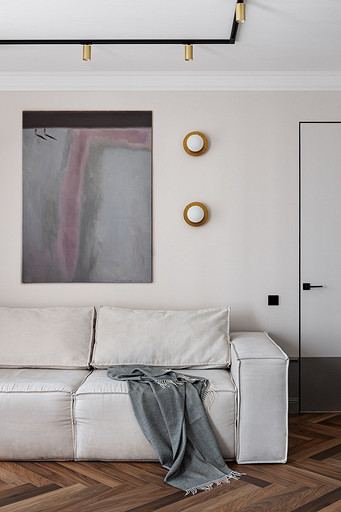 - Освещение: бра над диваном Odeon Light, трековые светильники Maytoni