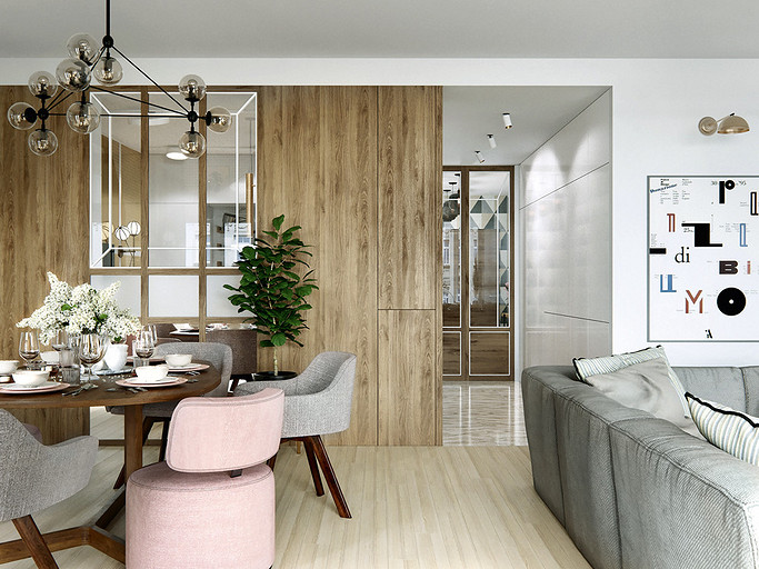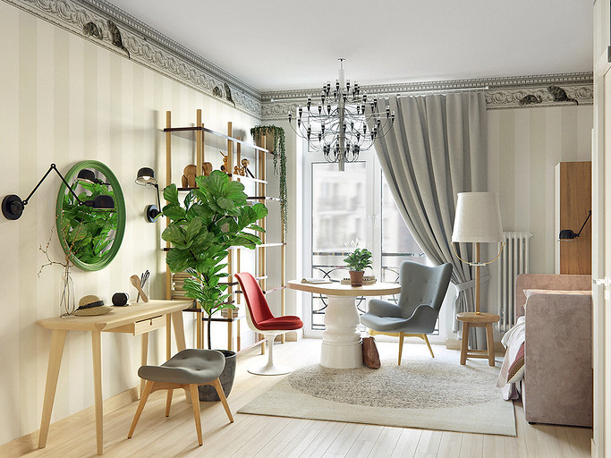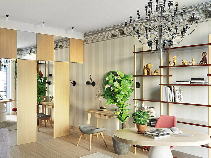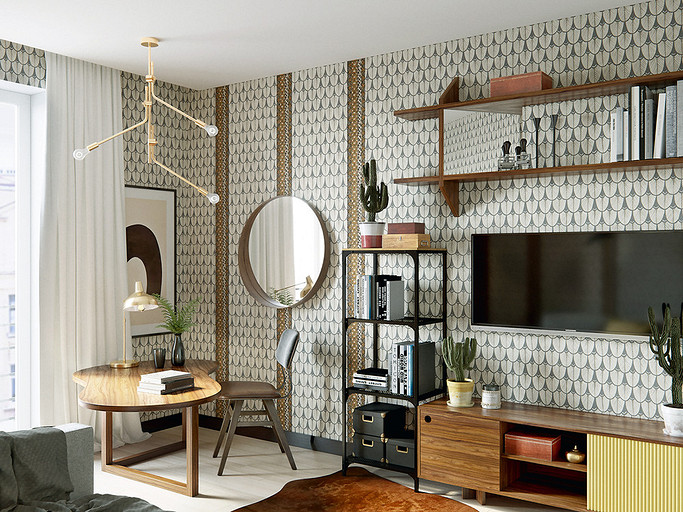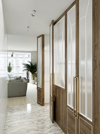 Оставаясь в рамках несложных в согласовании корректировок, архитектор-дизайнер организует максимально функциональное пространство. Помимо основных зон в квартире появляются хозпомещения. Стиль оформления — современный, с элементами скандинавской эстетики и mid-century modern.