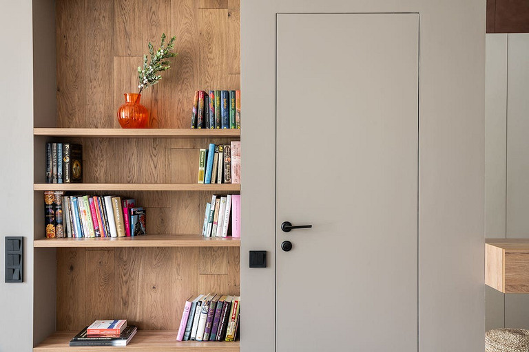 - Мебель: диван сделан на заказ, обеденные стулья и пуф La Forma, кровать Ascona, столики в спальне SK Design, тумба под ТВ ИКЕА, кухня и все столярные изделия сделаны на заказ