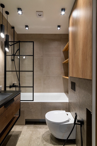 - Стены: обои под покраску, керамогранит в ванной Italon, плитка в санузле Vives