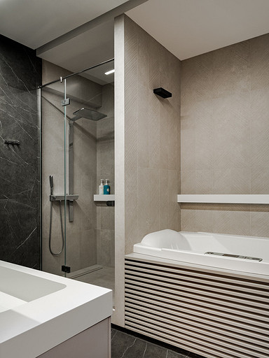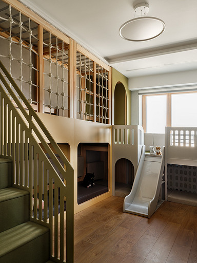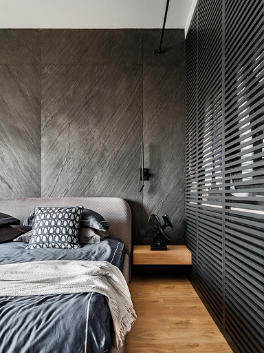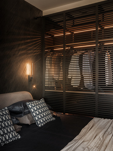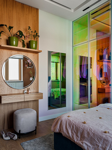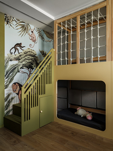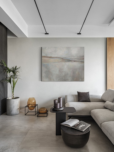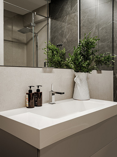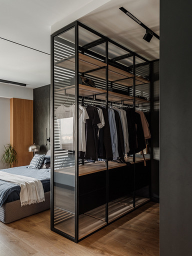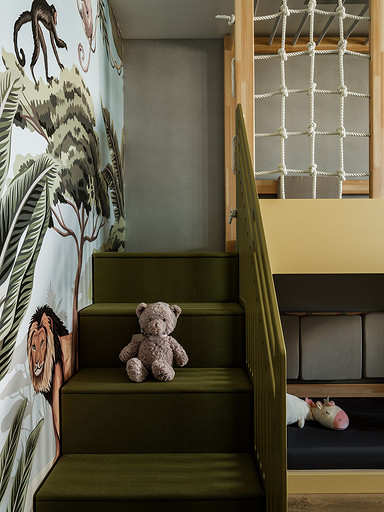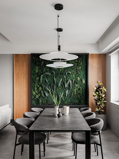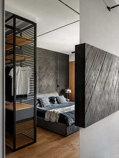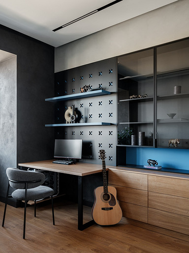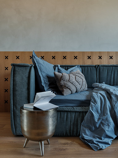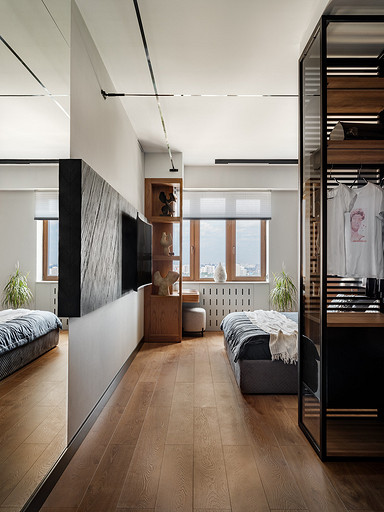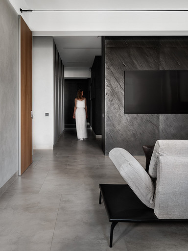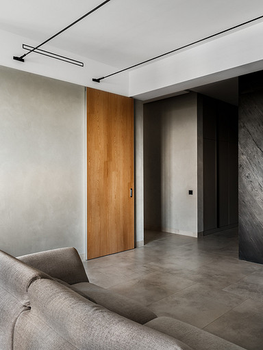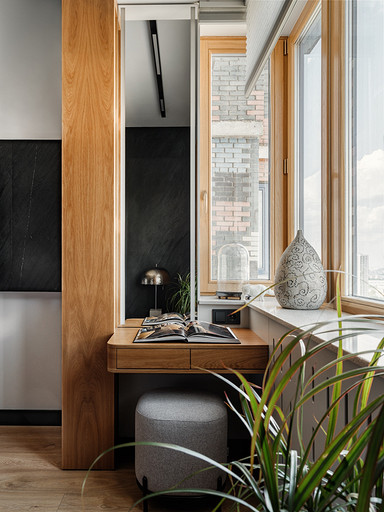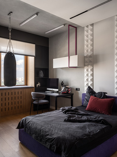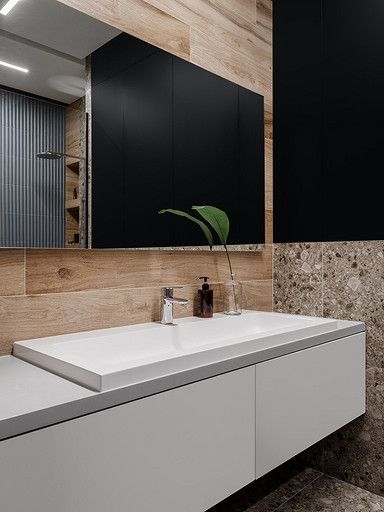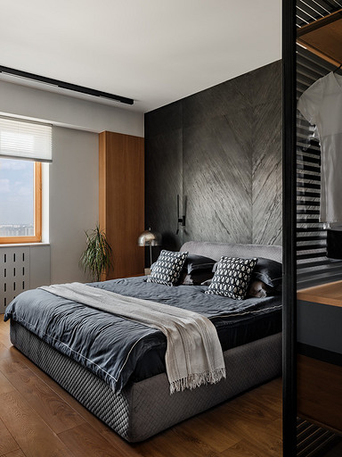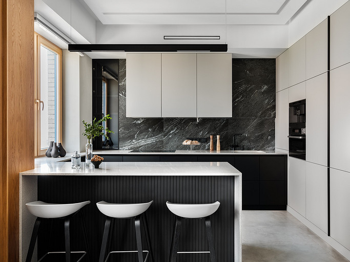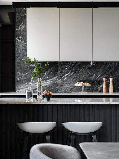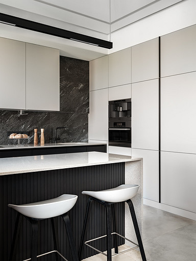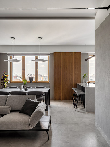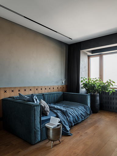 Квартира расположена на последнем этаже 23х этажного дома, из окон открывается панорама Москвы, монохромный ритм города, разбавленный зеленью деревьев. Мы не хотели отходить от того, что это интерьер мегаполиса, он современный и технологичный, но вместе с этим, оказываясь в этом пространстве, за счет использования натуральных материалов и природных цветов, приятных и естественных для человека, создается ощущение спокойствия, с настроением нордической природы, сдержанной, брутальной и немного аскетичной. Мы любим использовать в отделке природные натуральные материалы, но в тоже время для этого интерьера они должны были быть максимально практичными, поэтому для этого проекта мы выбрали каменный шпон. Это сланец графитового оттенка, его плавные рельефные линии, природные, но в тоже время очень архитектурные, стали отправным элементом нашей концепции, вокруг которого начали формироваться остальные решения. Пространство квартиры мы организовали линейно, разделив его на три части, следующих одна за другой, это общая зона, блок детских комнат и мастер-блок. Общее пространство включает в себя просторную прихожую, небольшую кладовую и кухню-гостиную с обеденной группой на восемь человек. Блок детских комнат располагается по центру линейной оси и имеет свои просторные ванные комнаты, чтобы дети могли комфортно существовать в своем личном пространстве. Учитывая, что в семье пять детей, нам необходимо было разместить три детские комнаты для каждого ребенка и одну комнату для двоих малышей, которая была бы и игровой и спальней одновременно. В дальней части квартиры обособленно располагается приватная зона, включающая в себя мастер-блок с ванной и гардеробной, а также постирочную и отдельную гардеробную комнату. Весь интерьер построен на балансе функциональности и эстетики. Мы использовали практичные и износостойкие материалы, при этом визуально отражающие концепцию интерьера. На полу в зонах общего пользования – керамогранит крупного формата с фактурой бетона, на стенах декоративная штукатурка в нейтральном светло-сером оттенке с приятной мягкой фактурой микроцемента. Брутальный каменный шпон контрастного графитового цвета с природным слоистым рельефом смягчается натуральным оттенком дерева и мягкими обтекаемыми формами мебели, стульев, дивана, обеденного стола. Как яркий акцент выступает вертикальное озеленение в обеденной зоне, элемент, который заказчики очень хотели видеть в своем интерьере. Живопись художницы из Калиниграда Виктории Шворень, аскетичный северный пейзаж Балтийского побережья, хорошо передает общее настроение интерьера.