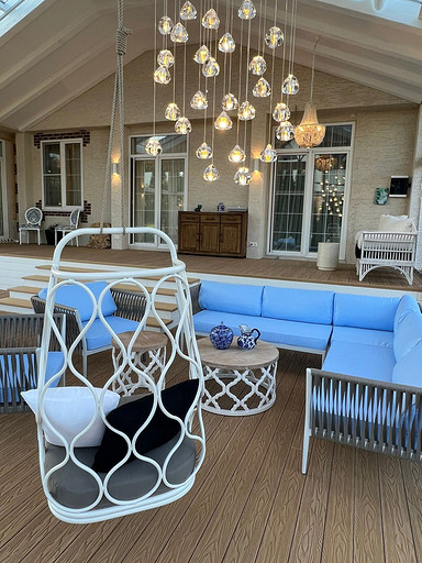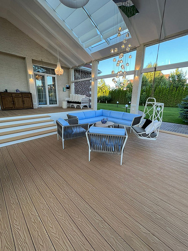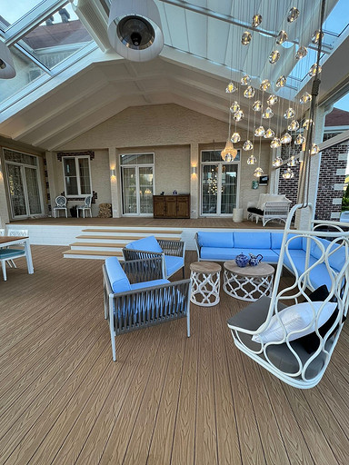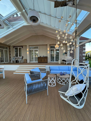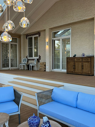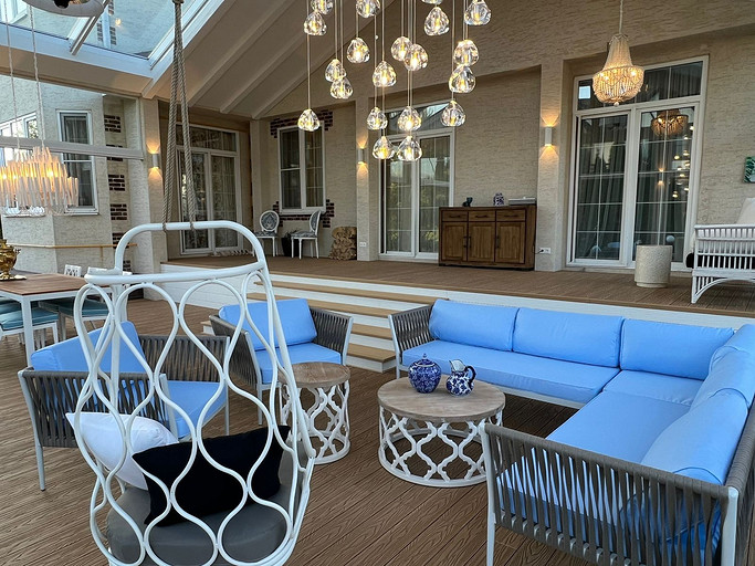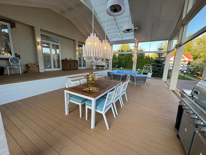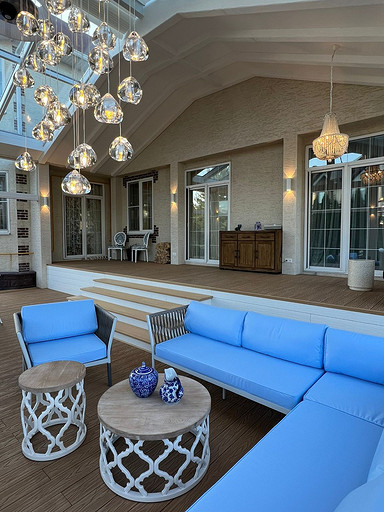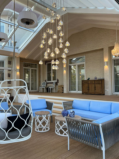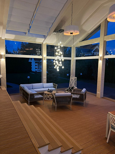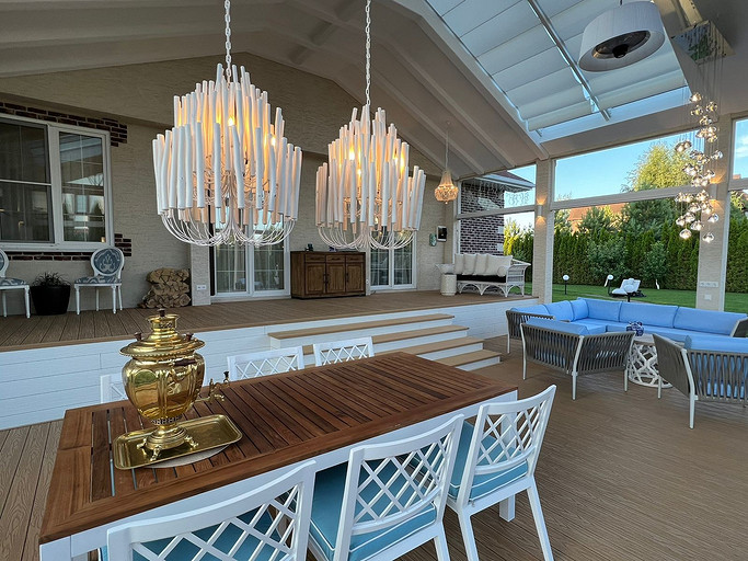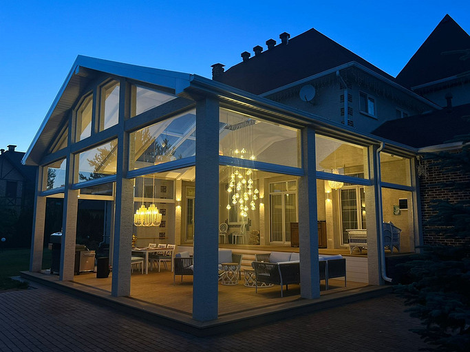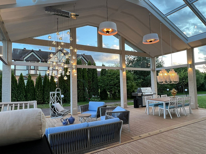 Беседка барбекю расположена в КП Княжье Озеро. Конструкция беседки выполнена из металлоконструкций с последующей облицовкой доской и влагостойкими панелями. Кровля выполнена со стеклянным фонарем, который обеспечивает достаточную инсоляцию даже не в солнечные дни. Расположение фонаря позволяет хорошо осветить зону обеденного стола и мягкую зону с диваном и креслами. Высота помещения обусловила наличие моторизированных систем штор как потолочного стеклянного фонаря, так и остекления съемных витражей.