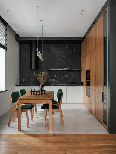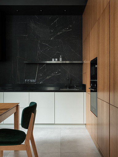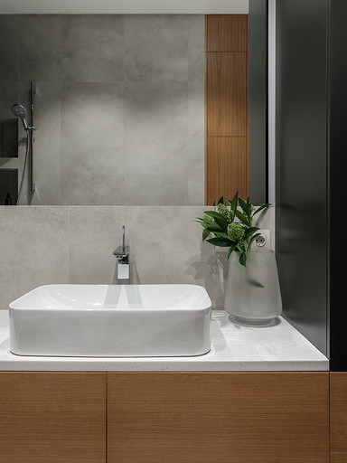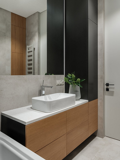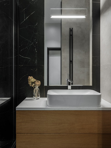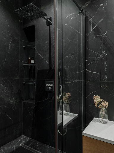 В душевой зоне мы позволили себе добавить больше темных оттенков. В отделке использовали тот же керамогранит, что и в кухне-гостиной, с фактурой черного мрамора