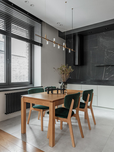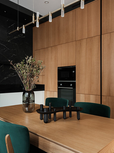 В качестве декоративного света в обеденной зоне мы использовали подвесной светильник, созданный предметным дизайнером Димой Логиновым для Centersvet. Светильник выполнен из натуральной латуни и выглядит невероятно эффектно.