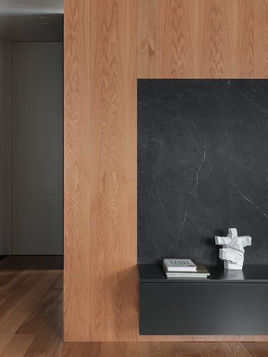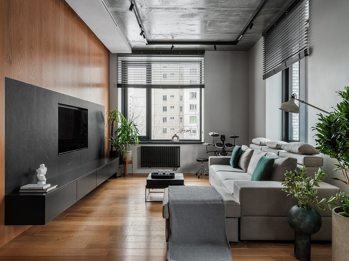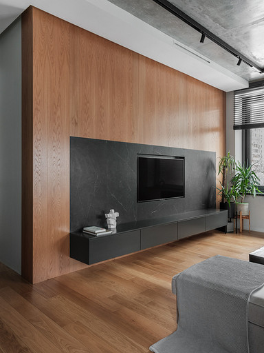 Стену, на которой расположен телевизор мы спроектировали в отделке деревянными панелями, теплый оттенок дубового шпона добавляет лаконичному интерьеру тепла и уюта