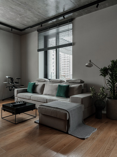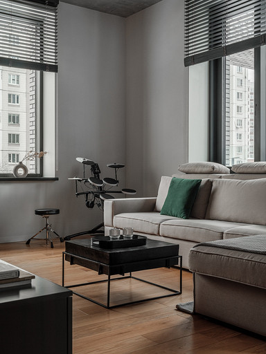 Отдельное место в интерьере занимает ударная установка, на которой играет заказчик, она создает творческий особенный вайб и изначально именно ее внешний вид подтолкнул нас к выбранной стилистике.