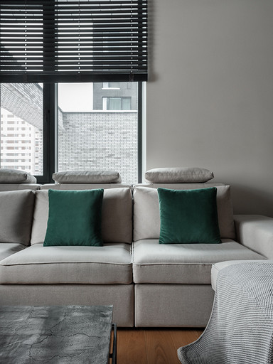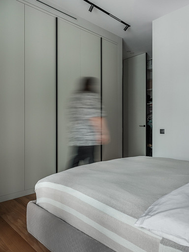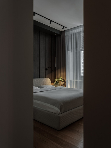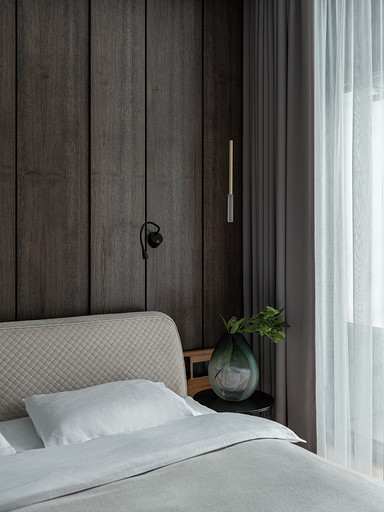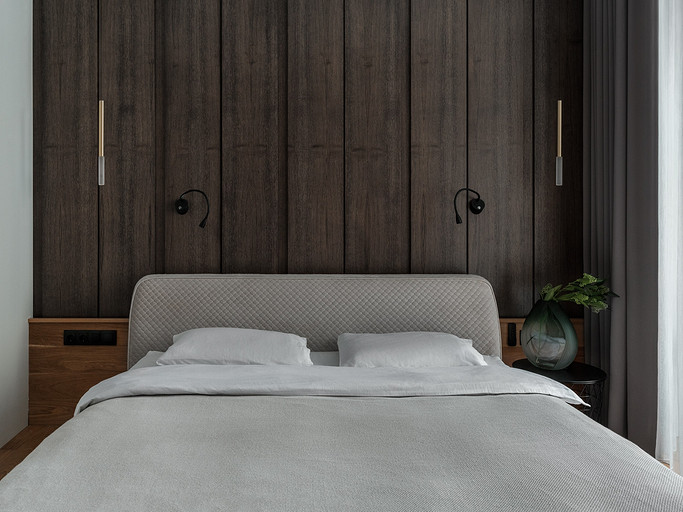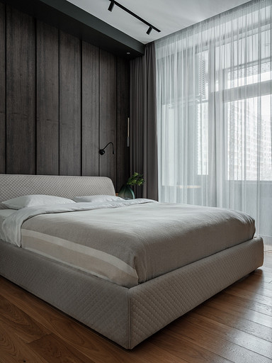 Спальня также выдержана в приглушенной гамме. Изголовье оформлено рельефными деревянными панелями графитового оттенка.