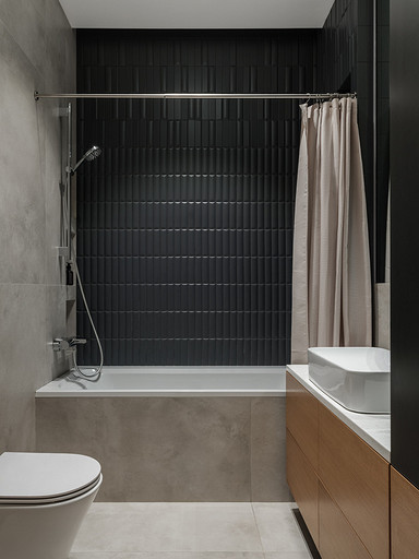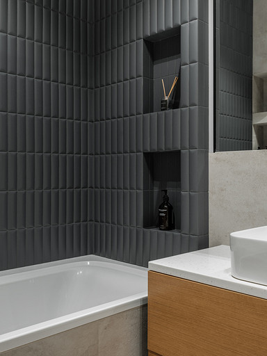 В ванной комнате, в продолжение общей концепции появился графитовый цвет в виде акцентной объемной плитки.