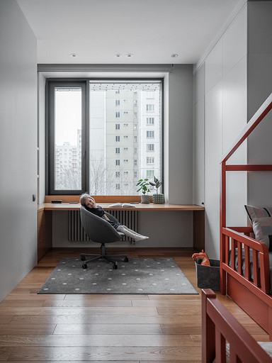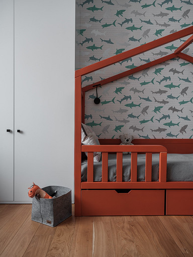 Пространство детской само по себе очень архитектурное и эффектное, нам оставалось его только подчеркнуть и наполнить необходимыми предметами мебели.