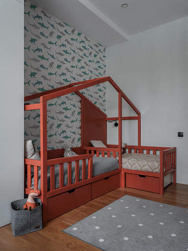 Домик со спальными местами выкрашен в кирпичный оттенок и является главным цветовым акцентом в интерьере