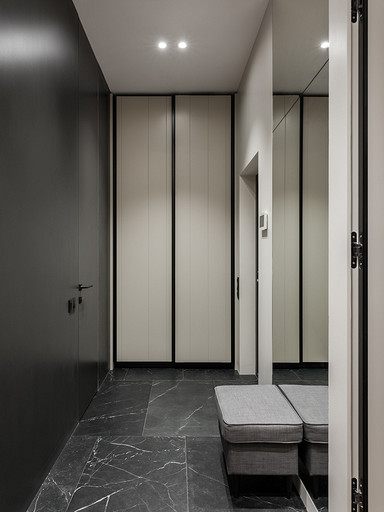 Прихожая также выполнена в общей стилистике. Рисунок на фасадах шкафа повторяет рисунок стеновых панелей в зоне ТВ в гостиной