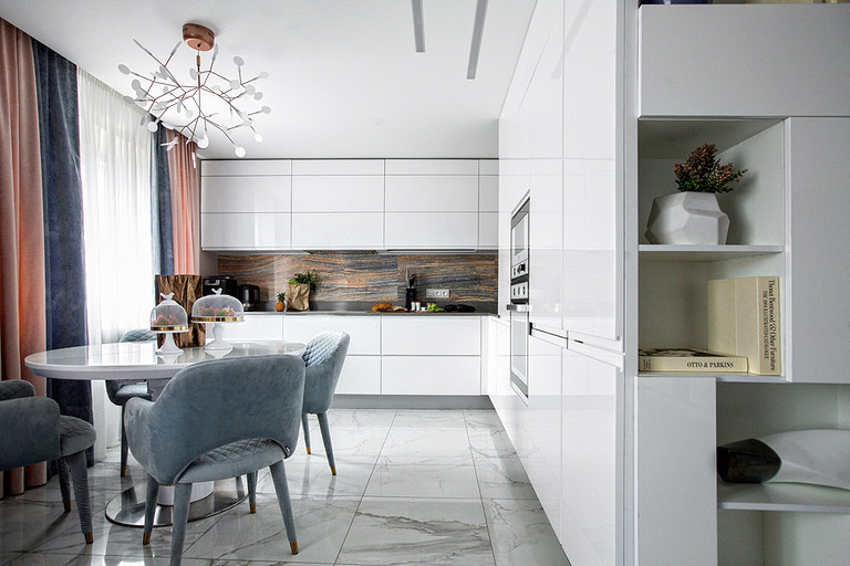 - Мебель: стол, шкафы — на заказ по эскизам автора проекта Wood Lip, стул Ghost Philippe Starck