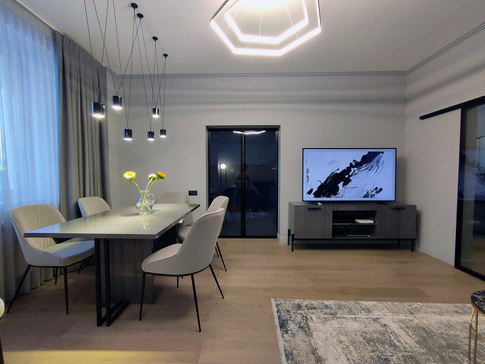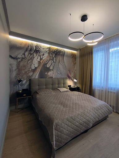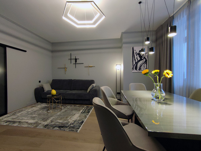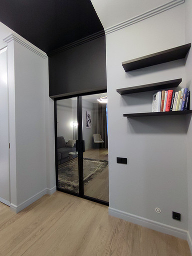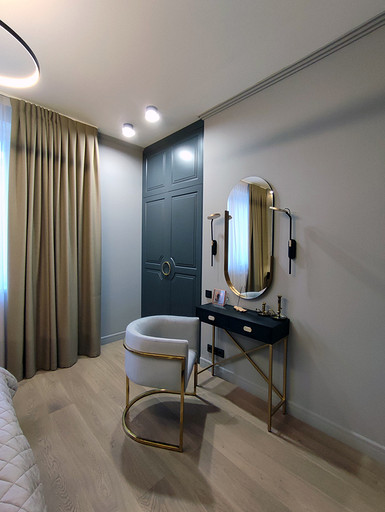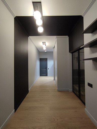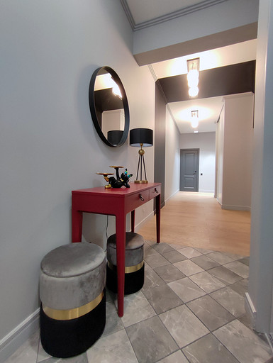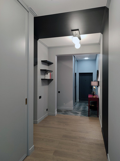 Дизайн-проект квартиры, расположенной в Западном округе столицы, общей площадью 89 кв.м, выполнен согласно утвержденному ТЗ заказчика. Планировка квартиры включает в себя: прихожую-холл, коридор, спальню, гостиную, кухню, ванную комнату, гостевой с/у, кладовку и утепленную лоджию. Планировка квартиры не выходит за рамки БТИ. Проект данной квартиры выполнен в современном стиле contemporary модернизм. С присуще этому направлению лаконичной планировкой, простому, ненавязчивому оформлению. Этот стиль собран из технологичного хай-тека, утонченного минимализма и роскошной классики. Однако contemporary более комфортный и приспособленный для повседневной жизни. Несмотря на то, что интерьеры этого стиля не предполагают использование ярких красок и узоров, они не кажутся бледными и монотонными. Это достигается благодаря сочетанию глянцевых и шероховатых текстур, зонированию помещений. Также монохромность обстановки разбавляется применением ярких акцентов в умеренных количествах.