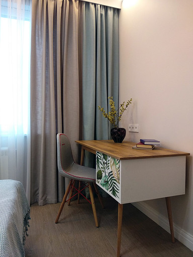 Проект квартиры в жилом комплексе «Лучи», общей площадью 41,1 кв.м, выполнен согласно утвержденному ТЗ заказчика. Комплекс находится в Западном округе столицы, в районе Солнцево. Планировка квартиры включает в себя: прихожую-холл, спальню, кухню, ванную комнату, лоджию. Также имеется гардеробная комната. Планировка квартиры не выходит за рамки БТИ. Проект данной квартиры выполнен в современном стиле с использованием в интерьере предметов мебели и декора стилистически актуально сочетаемых в настоящее время. Основной задачей при создании данного интерьера было функциональное использование пространства, максимально удобного для хозяев. Цветовые сочетания интерьера это мягкие, сложные оттенки, тщательно подобранные, имеющие акцентные «пятна». Придерживаясь стилистическому решению, в интерьере используется керамическая плитка и керамогранит в современном стиле, а также кварц виниловая плитка с текстурой дерева. За счет светлых оттенков и объемной 3D поверхности на стене в спальне, помещения квартиры обретают дополнительное ощущение пространства и легкости. А за счет скрытой подсветки, можно создать атмосферу релакса и уюта, что крайне необходимо в современном мире. Подобранные осветительные приборы гармонично дополняют проект, и являются неотъемлемой его частью.