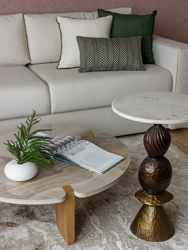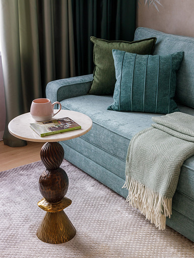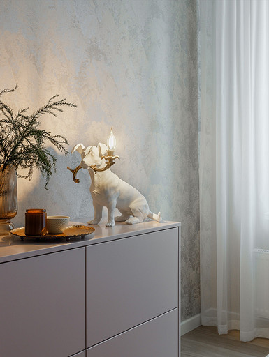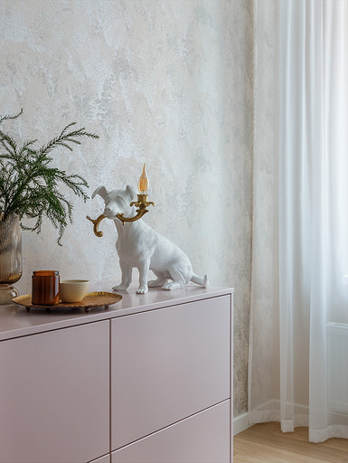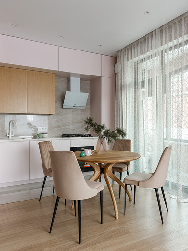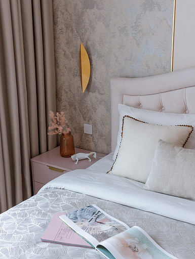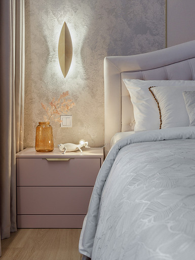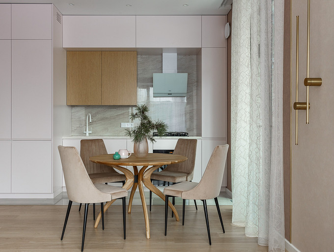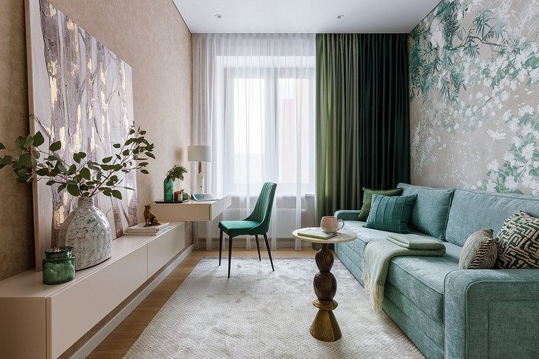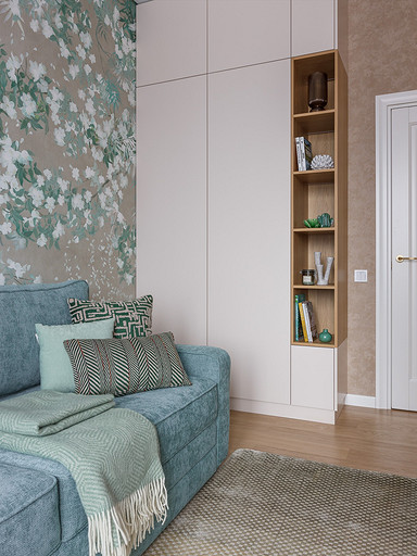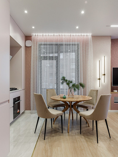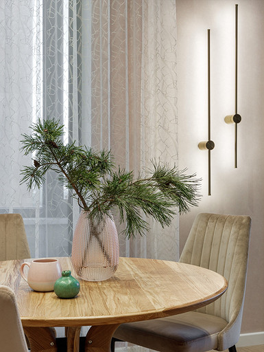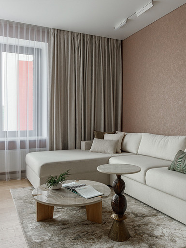 Новостройка ЖК Резиденция Архитектор находится в самом центре Казани, около строительного университета, в непосредственной близости от всех транспортных узлов. Квартира была нулевая, сдавалась в черновой отделке. В перепланировки не было необходимости. Максимум, что было возведено – это простенки для встраиваемых шкафов. Подбор и расстановка мебели были продиктованы стилем и функционалом для небольшой квадратуры с данной конфигурацией и экономией места — это встроенные шкафы с выдвижными секциями; кровать с организованной системой хранения; вместительный кухонный гарнитур до потолка, компактное рабочее место в кабинете На весь проект использовали лёгкий прозрачный тюль, чтобы сохранить лёгкость пространства и оставить просматриваемым вид за окном. Для кабинета использовали ткань с фактурой шелка с благородным блеском. Ткань хорошо драпируется и создаёт мягкие складки. Для спальни использована однотонная портьерная ткань в которой сочетаются матовые и глянцевые нити. Это делает фактуру ткани сложной, интересной. В гостиной на двух окнах решили использовать компаньоны. На панорамном окне на балкон висит тюль с листками, а на угловом окне в зоне дивана портьеры из плотной ткани, а в спальне покрывало из этой же ткани.