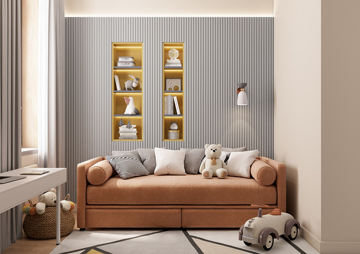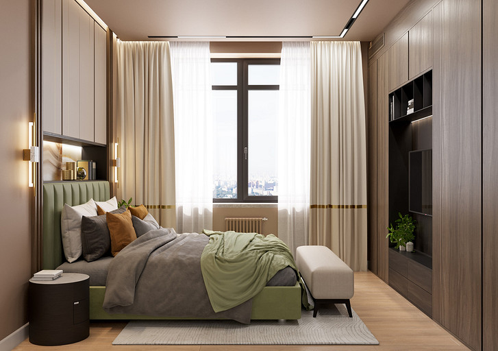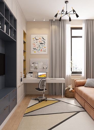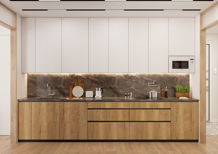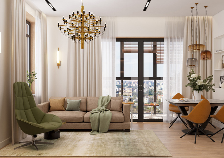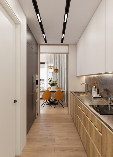Квартира 100м2 для семьи с тремя детьми с интересной перепланировкой и выносом кухни в коридор благодаря чему мы полностью использовали бесполезную зону длинного коридора и расширили общесемейное пространство кухни-гостиной перенеся его в помещение с панорамными окнами