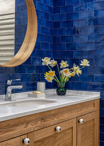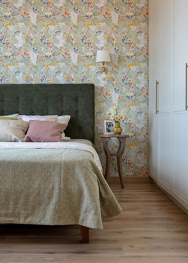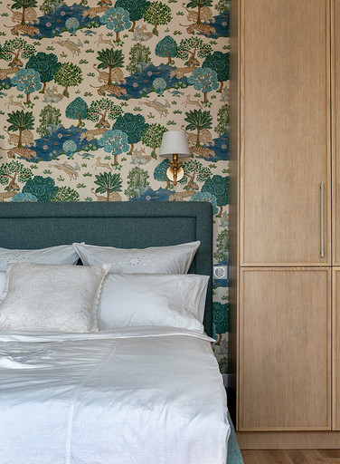 - Стены: обои в мастер-спальне Midbec, Waverly, в кабинет и спальне дочери Sanderson, в холлах York, в гостиной Khroma, плитка в санузлах Equipe