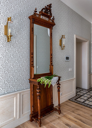- Пол: массивная доска Antic Wood, плитка в холле TopCer