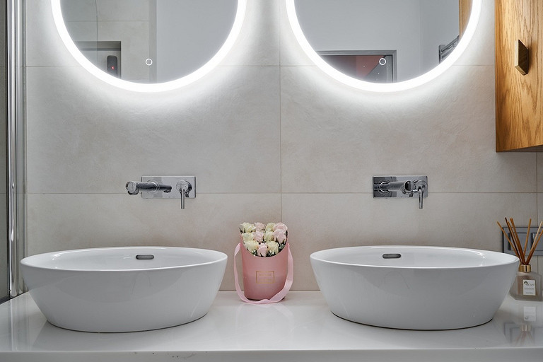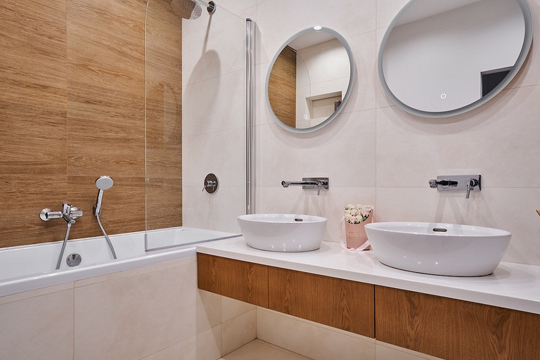 - Сантехника: раковина Laufen, ванна Duravit, душевая стойка, смесители и душевая шторка WasserKraft