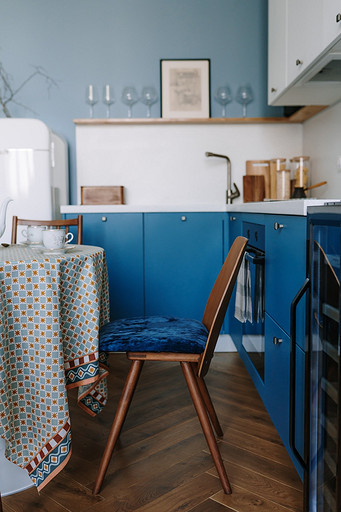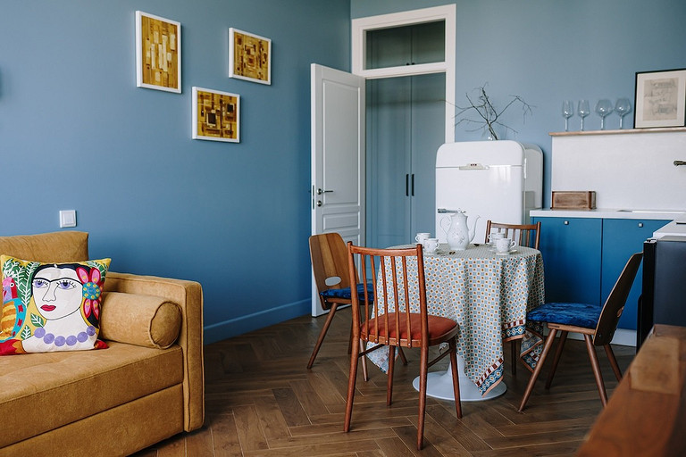- Мебель: кухня «Стильные кухни», диван «ОГОГО Обстановочка!», хайборд и стулья — винтаж