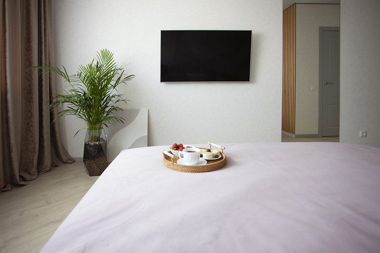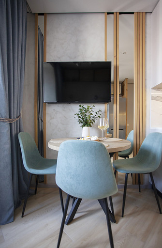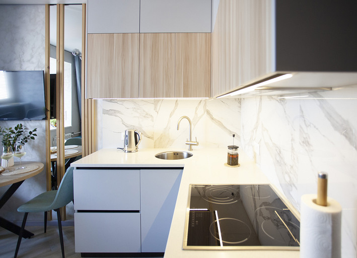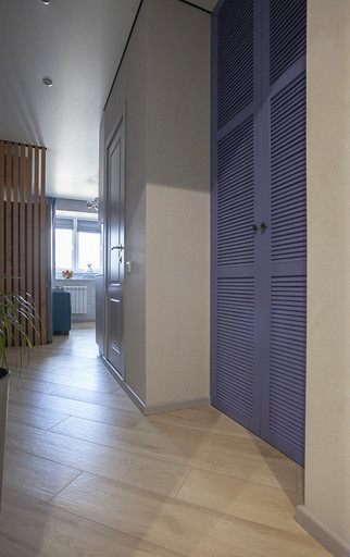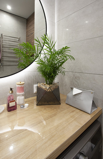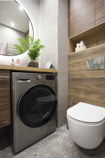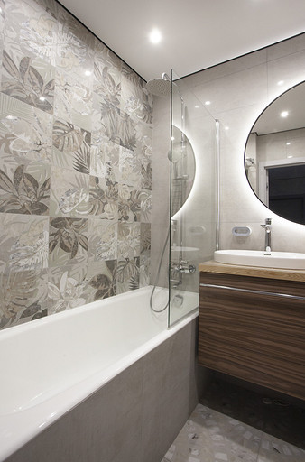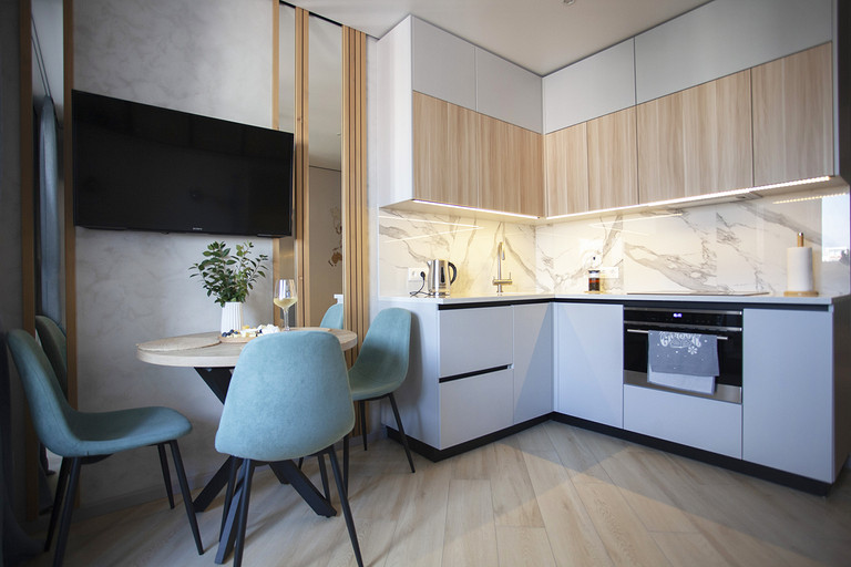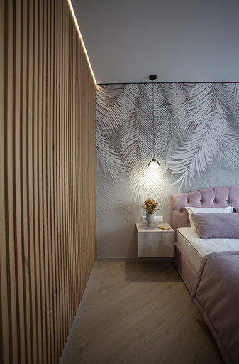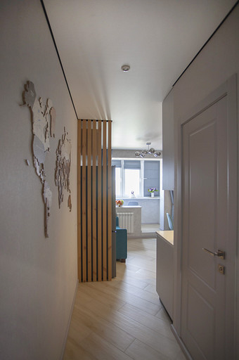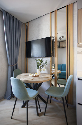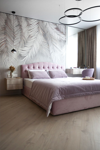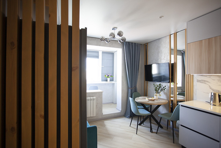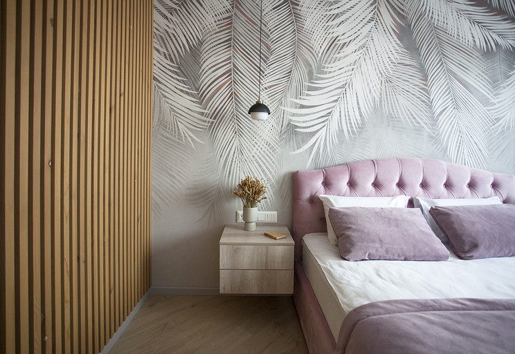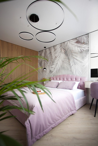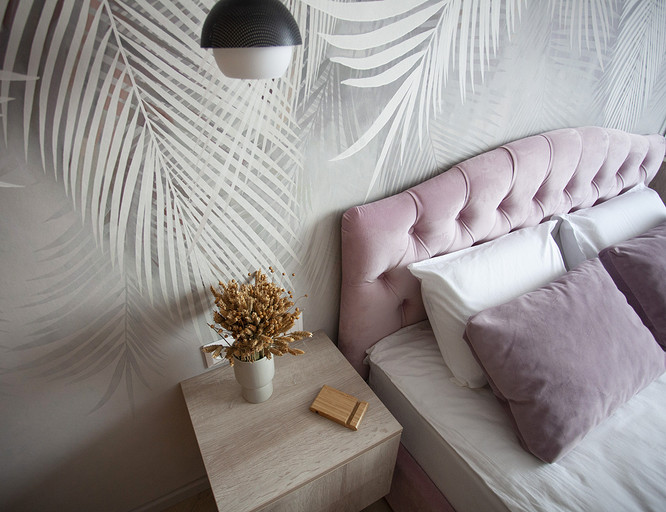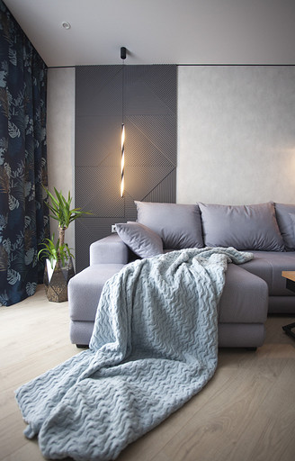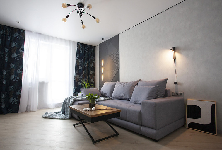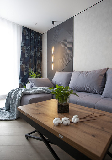 Мой клиент девушка, которой хотелось создать уютное красивое пространство для себя. Квартира была куплена на вторичке и требовала капитальный ремонт. Были полностью заменены оконные блоки, сантехника, водоснабжение, электрика. В интерьере в приоритете использовались недорогие, но натуральные материалы. На кухне было решено организовать несколько пространств: для готовки, приема пищи и отдыха. Небольшой, но функциональный гарнитур позволяет разместить кухонные принадлежности. Напротив обеденного стола разместился компактный раскладной диван. Отделка стен выполнена декоративной штукатуркой. ТВ зона декорирована деревянными рейками и зеркалами по высоте стены. Изначально спальня была большого размера, что помогло создать дополнительное место хранения. Была запроектирована гардеробная, наружная стена которой выполнена декоративными деревянными рейками с подсветкой. В изголовье кровати выполнена отделка из фотопанно с растительным орнаментом. Справа от кровати разместили туалетный столик и зеркало с подсветкой до потолка. Напротив кровати разместилась ТВ зона и большое зеркало до потолка. Вторая комната — просторная гостиная с большим угловым диваном и зоной ТВ, запроектирована в серых, темных оттенках. Гостевой санузел выполнен в контрасте белого и черного цветов. Ванная комната, напротив, выполнена в светлых натуральных оттенках, с ярким акцентом в виде стены из керамогранита с растительным принтом. Столешница из натурального дерева контрастирует с цветовой гаммой ванной комнаты. Общий интерьер этой квартиры в современном стиле, наполнен цветом и яркими деталями.
