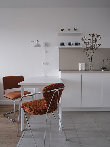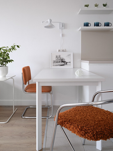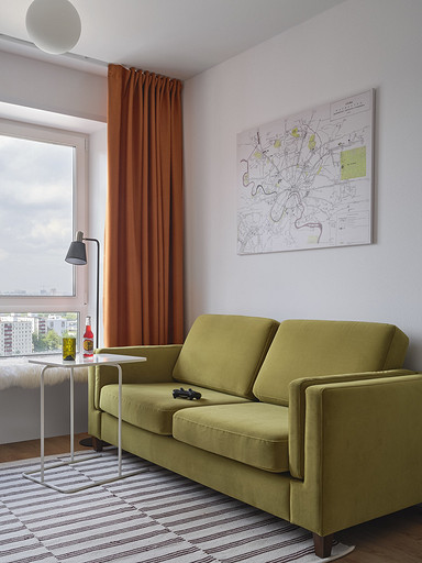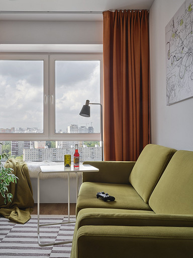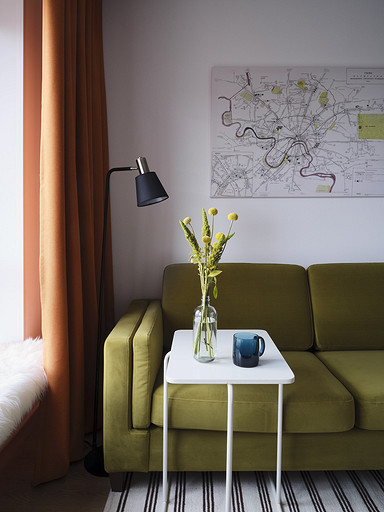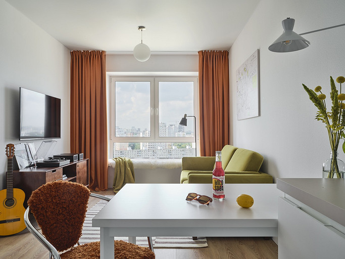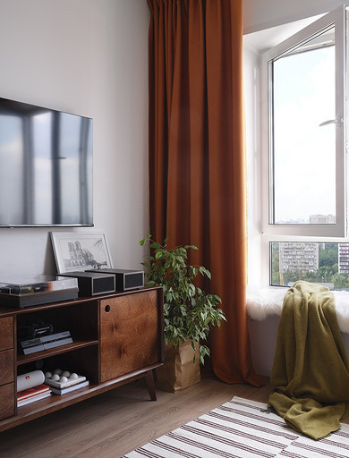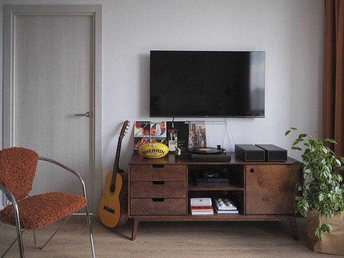 - Мебель: кухонный гарнитур «Стильные кухни», диван The Furny, ТВ-консоль Skog, столик ИКЕА, обеденный стол сделан на заказ, стулья — винтаж