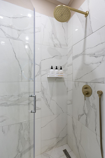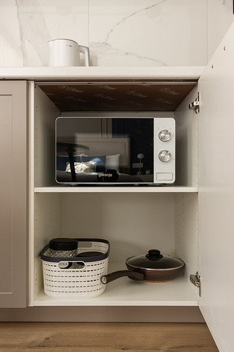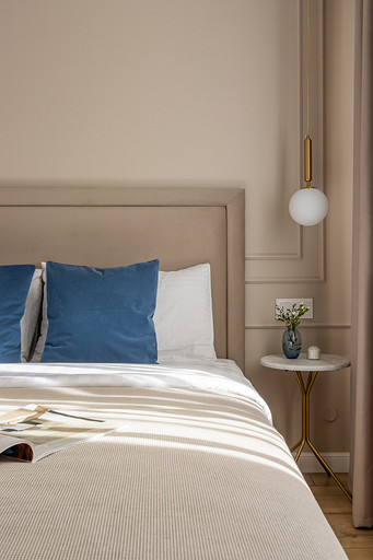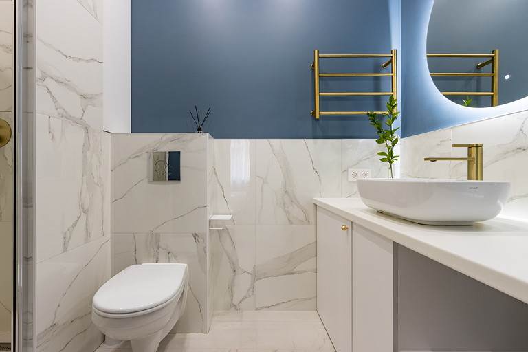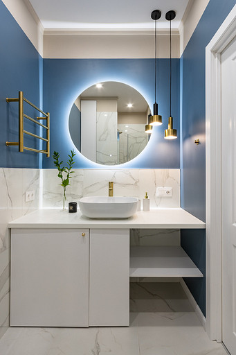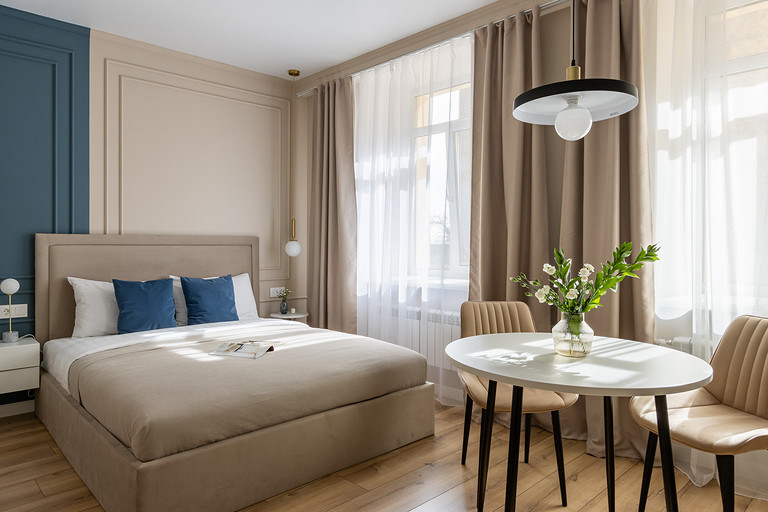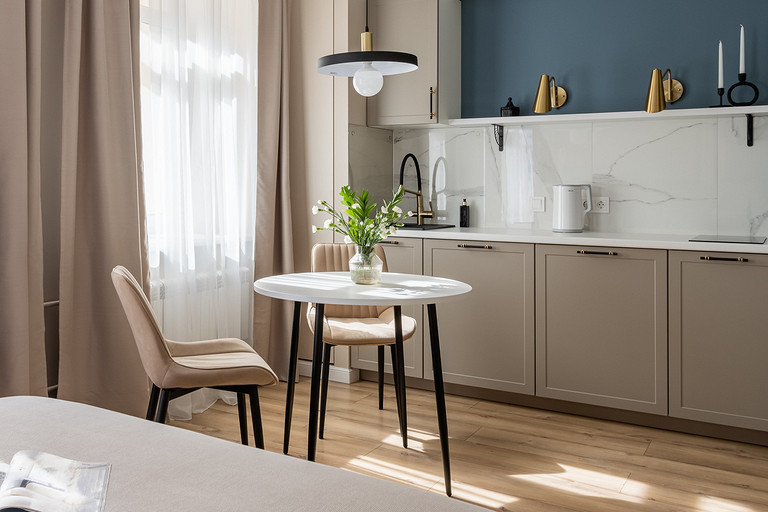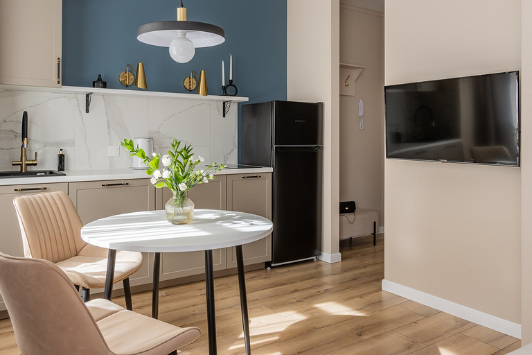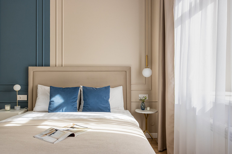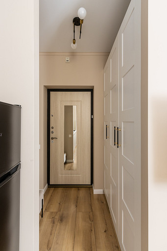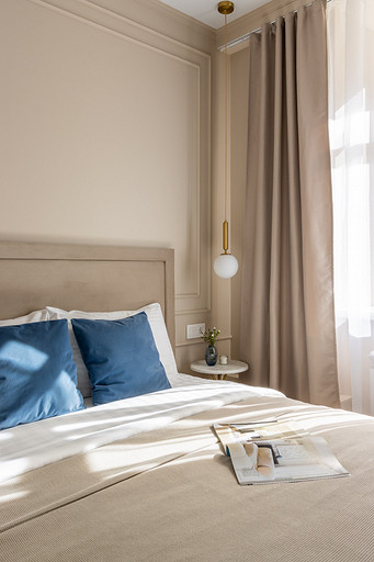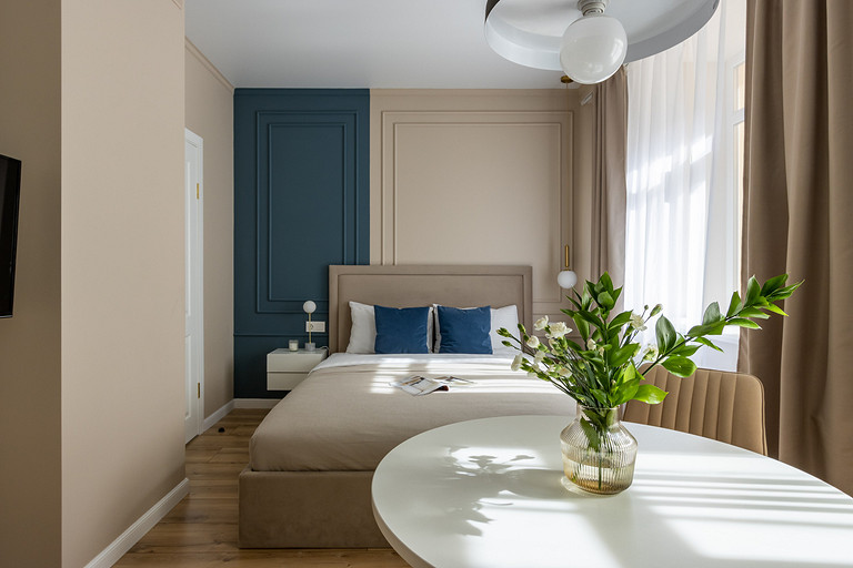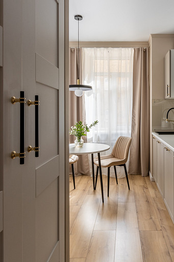 Квартира-студия 24 кв.м. в доме-реновации в Санкт-Петербурге. Доходный дом М.Е.Егорова 1912 года, застройщик сохранил фасад здания и сделал полную перепланировку внутри. Заказчики поставили передо мной задачу создать квартиру для краткосрочной аренды. Элегантный, уютный интерьер. Для того, чтобы разместить все необходимые предметы мебели перенесли вход в санузел и возвели стены, ограничивающие шкаф в прихожей и кухню. Шкаф и кухня — готовые варианты из Хофф и Леруа Мерлен, стены воздвигали сразу под эту корпусную мебель. Бежевый фоновый цвет стен делает студию очень уютной, а синие акцентные стены добавляют цвет и изюминку в интерьер, а латунные металлические элементы и глянцевый керамогранит на фартуке и стенах санузла добавляет шика. Как и во всех своих проектах я скрыла всю бытовую технику, кроме холодильника. Он небольшой, высотой 150 см. СВЧ разместилась в нижней базе кухни, а стиральная машина в тумбе под раковиной, в такой эффектный санузел не хотелось ставить стиральную машину! Квартира получилась очень уютная и стильная и уже успела найти своих постоянных гостей!